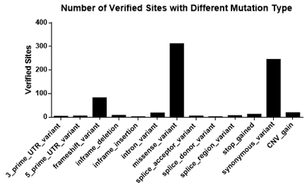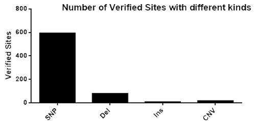 表1. 泛腫瘤相關(guān)靶向基因部分展示 3. 染色體全覆蓋,除了Y染色體外,其他染色體都有涉及; 圖1. 在不同染色體編號(hào)上的位點(diǎn)數(shù)(經(jīng)過驗(yàn)證的位點(diǎn)) 4. 變異種類多:涉及SNP,deletion,insertion,CNV等等; 圖2. 不同種類突變形式的位點(diǎn)數(shù)(經(jīng)過驗(yàn)證的位點(diǎn)) 5. 突變頻率全覆蓋,從1%-100%,各區(qū)間都有涉及; 圖3. 不同突變頻率的位點(diǎn)數(shù)(經(jīng)過驗(yàn)證的位點(diǎn)) 6. 突變類型全覆蓋,有UTR區(qū)域,有內(nèi)含子,有外顯子,有錯(cuò)義突變,有同義突變,有供體變異等等; 圖4. 突變細(xì)分種類的位點(diǎn)數(shù)(經(jīng)過驗(yàn)證的位點(diǎn)) 7. 位點(diǎn)多,超過680個(gè)位點(diǎn),全部有對(duì)應(yīng)的Cosmic ID或/和dbSNP ID注釋; 圖5. 經(jīng)過dbSNP ID和Cosmic ID注釋的位點(diǎn)數(shù)(經(jīng)過驗(yàn)證的位點(diǎn)) 8. 多平臺(tái)驗(yàn)證,數(shù)據(jù)準(zhǔn)確可信賴; 8.1 其中1000x panel驗(yàn)證16個(gè)位點(diǎn),panel為知名商業(yè)化公司產(chǎn)品; 表2. 16個(gè)經(jīng)過1000x NGS-Panel試劑盒驗(yàn)證的位點(diǎn)信息 8.2 DdPCR驗(yàn)證8個(gè)位點(diǎn),Bio-Rad QX200和Bio-Rad原裝試劑 表3. 8個(gè)經(jīng)過DdPCR(bio-rad)試劑盒驗(yàn)證的位點(diǎn)信息 8.3 500X WES驗(yàn)證所有位點(diǎn),IDT xGenExome Research Panel v1.0捕獲,HiSeq X-TEN測(cè)序 表4. 500X WES驗(yàn)證的400個(gè)基因信息 9. 基因覆蓋科學(xué),超過400個(gè)基因,覆蓋國內(nèi)外多個(gè)知名panel的設(shè)計(jì); 表5. 基因覆蓋率比較 免費(fèi)試用活動(dòng)開始了,感興趣的親們可以聯(lián)系我們4008-750-250 |