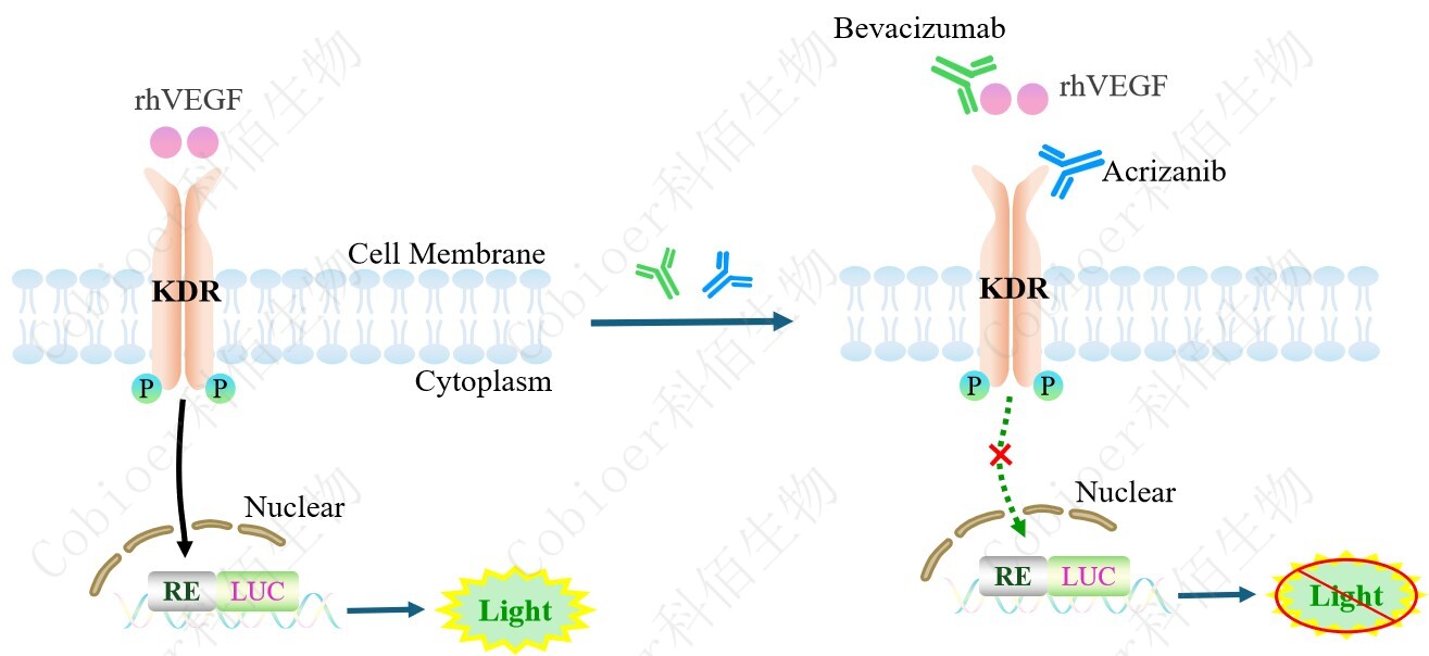 VEGF(KDR) Effector Reporter Cell 報告基因藥靶模型很好的模擬了體內(nèi) VEGF(KDR)的信號轉(zhuǎn)導過程,原理見下圖所示。