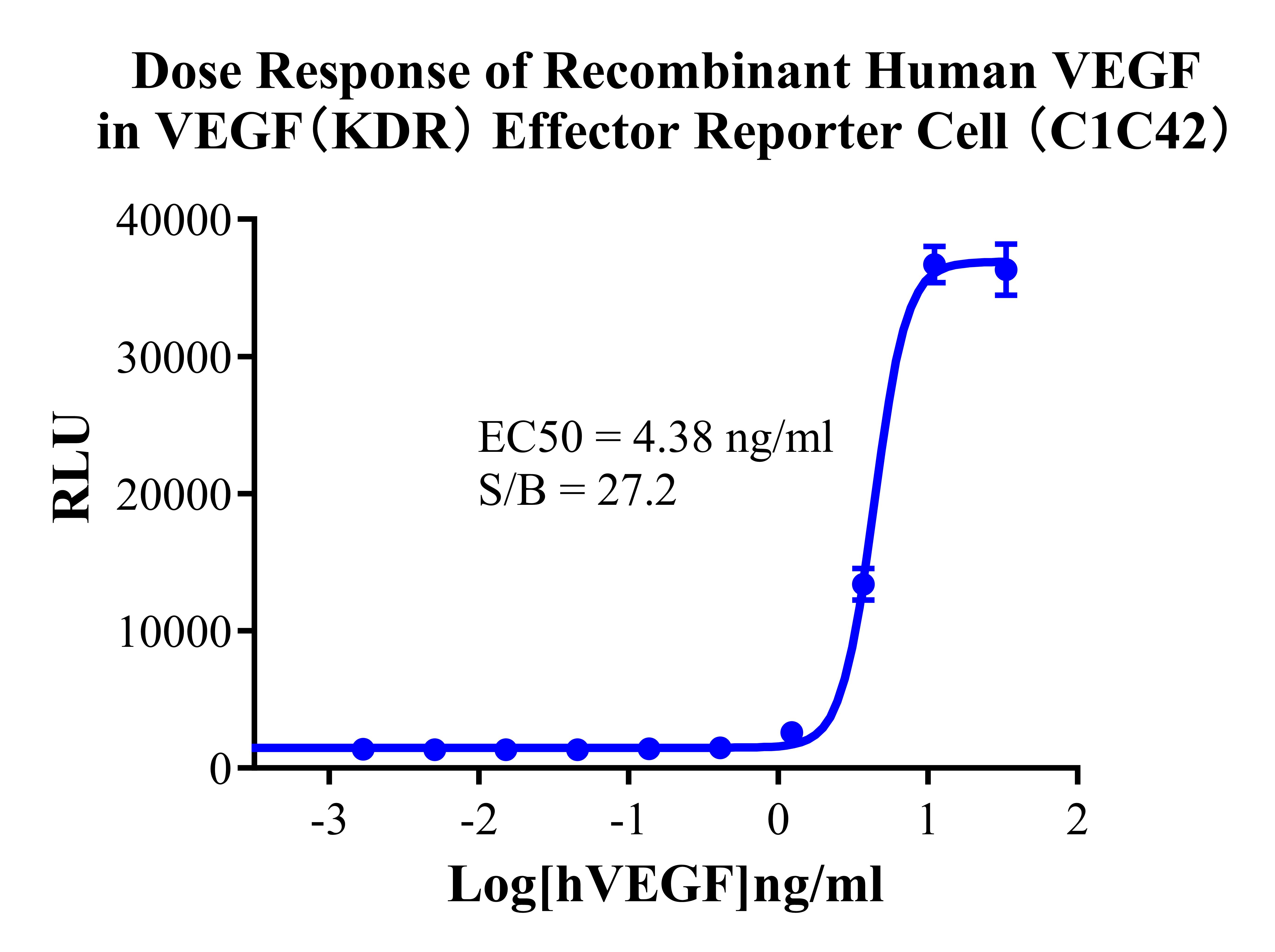 Figure 2. Dose Response of Recombinant Human VEGF in VEGF(KDR) Effector Reporter Cells (C1C42). Figure 3. Inhibition of rhVEGF Induced Reporter Activity by KDR Inhibitor/VEGF Neutralization Ab in VEGF(KDR) Effector Reporter Cell (C1C42). |