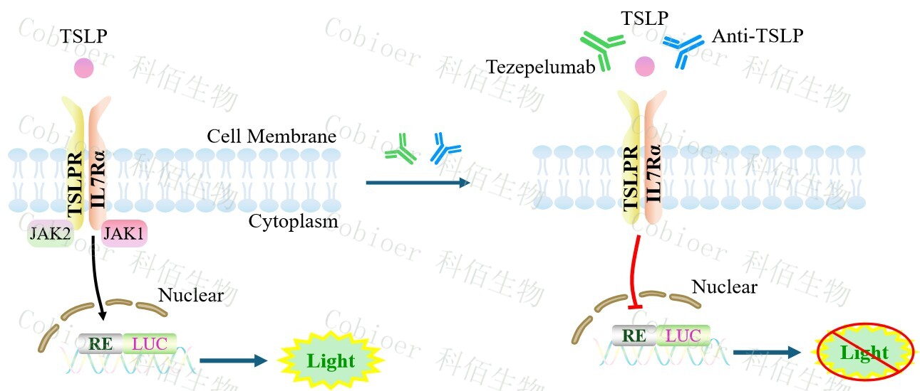 TSLP Effector Reporter Cell 報告基因藥靶模型很好的模擬了體內(nèi) TSLP 的信號轉導過程,原理見下圖所示。![]() Figure 1. TSLP Effector Reporter Cell 細胞模型原理圖 |