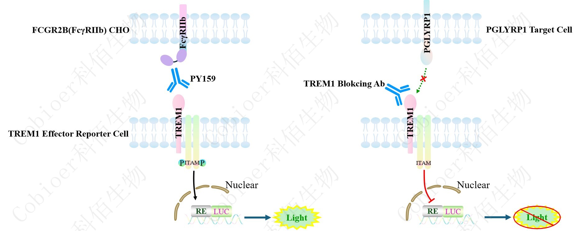 TREM1 Effector Reporter 報(bào)告基因藥靶模型很好的模擬了體內(nèi) TREM1 的信號(hào)轉(zhuǎn)導(dǎo)過程, 原理見下圖 所示。![]() Figure 1. TREM1 Effector Reporter 細(xì)胞模型原理圖 |