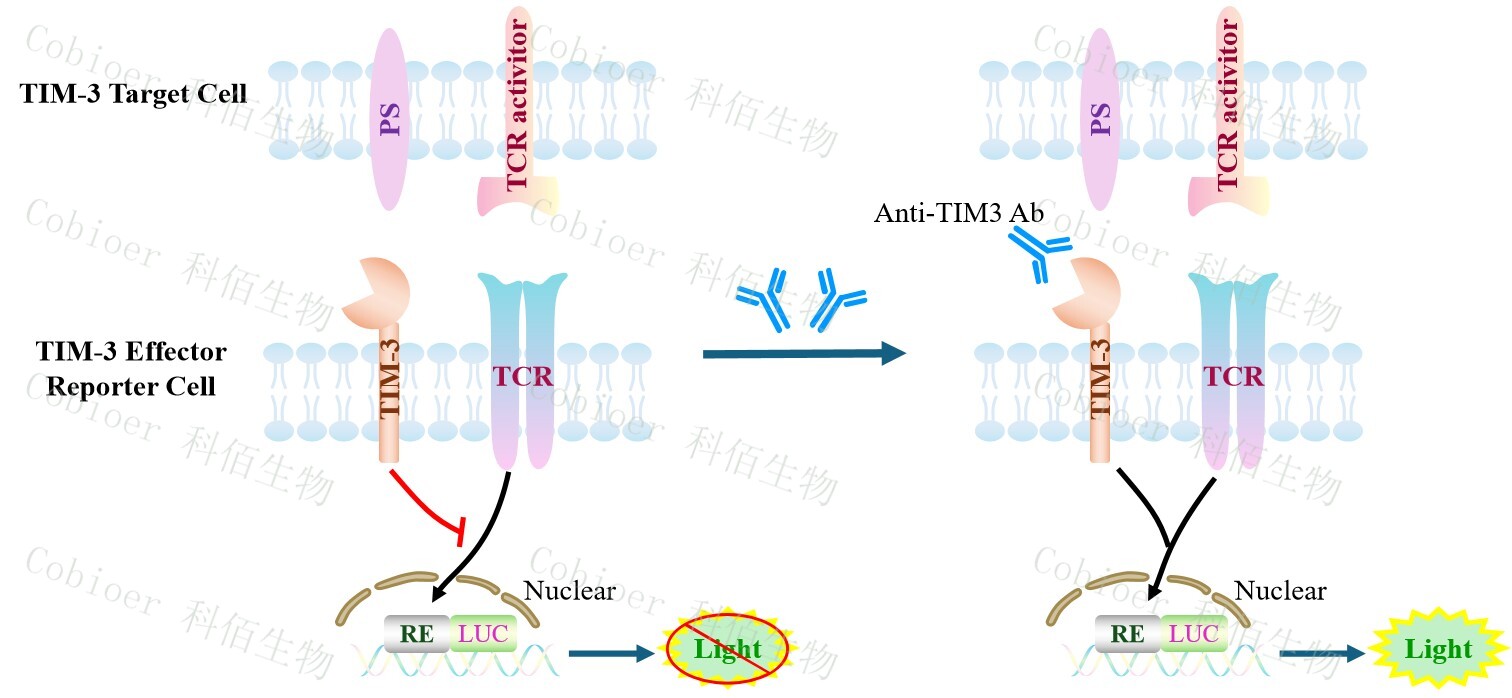 TIM-3 Effector Reporter Cell 報(bào)告基因藥靶模型很好的模擬了體內(nèi) TIM-3 的信號(hào)轉(zhuǎn)導(dǎo)過(guò)程,原理見(jiàn)下圖所示。![]() Figure 1. TIM-3 Effector Reporter Cell 細(xì)胞模型原理圖 |