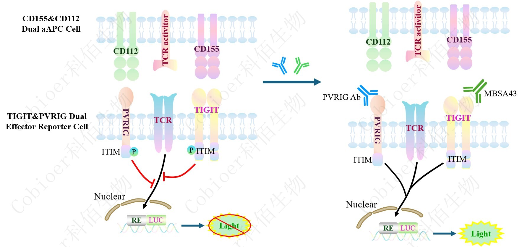 CD155&CD112 Dual aAPC Cell 作為 TIGIT&PVRIG Dual Effector Reporter Cell 的靶細(xì) 胞,很好的模擬了體內(nèi) TIGIT&PVRIG 的信號(hào)轉(zhuǎn)導(dǎo)過(guò)程,原理見下圖所示。