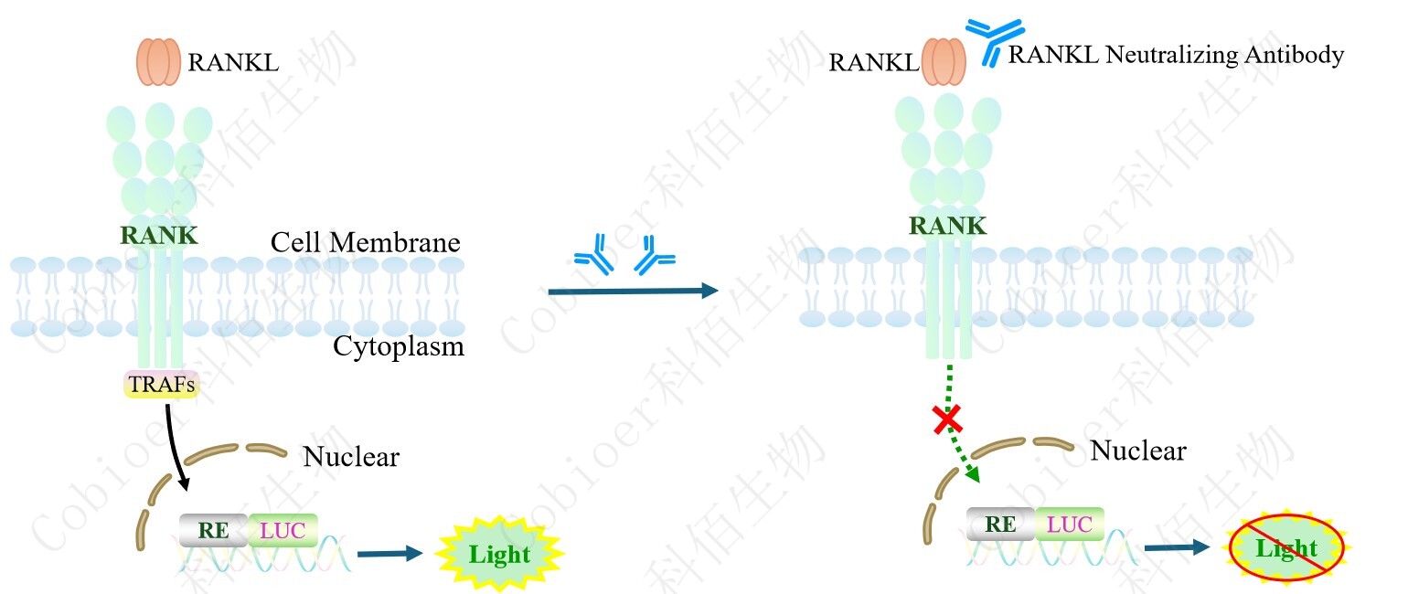 RANK Effector Reporter Cell 報(bào)告基因藥靶模型很好的模擬了體內(nèi) RANK 的信號(hào)轉(zhuǎn)導(dǎo)過(guò)程,原理見(jiàn)下圖所示。![]() Figure 1. RANK Effector Reporter Cell 細(xì)胞模型原理圖 |