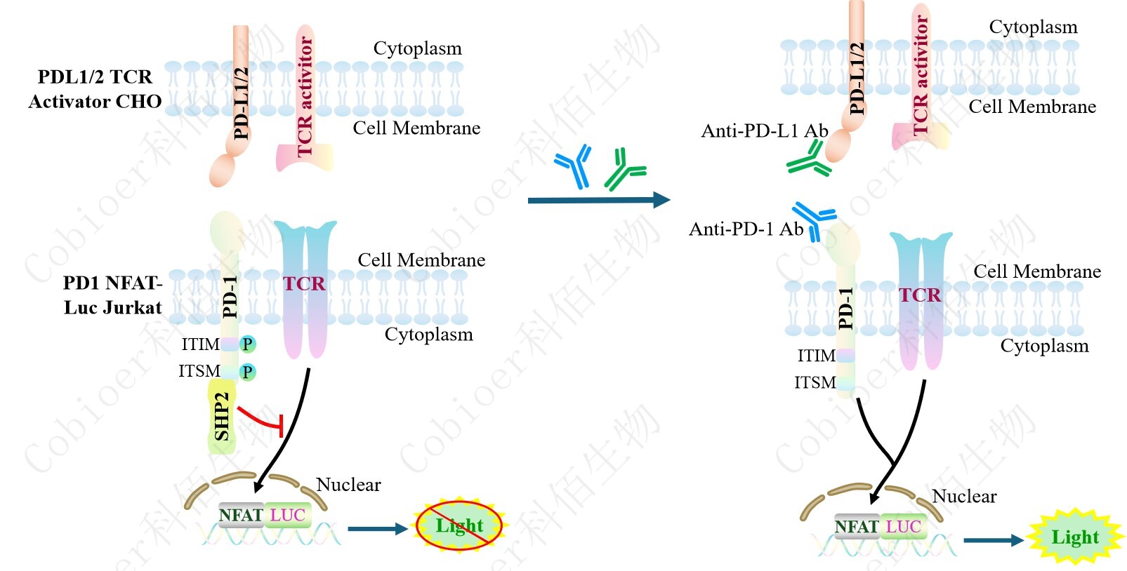 ![]() Figure 6. Detect Luciferase assay by Ultra Luciferase Detection Kit CBPH0001(we strongly suggest to purchase from Cobioer). Dose response of PD1 Agonist Antibody in PD1 NFAT-Luc Jurkat(C16) with FcγR aAPC Cell(C1). |