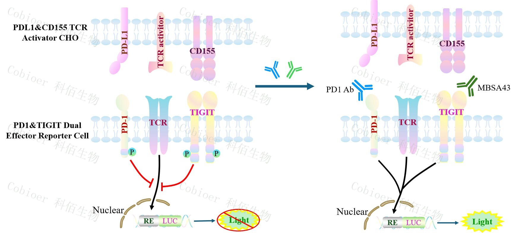 PDL1&CD155 TCR Activator CHO 作為 PD1&TIGIT Dual Effector Reporter Cell 的靶細 胞,很好的模擬了體內 PD1&TIGIT 的信號轉導過程,原理見下圖所示。