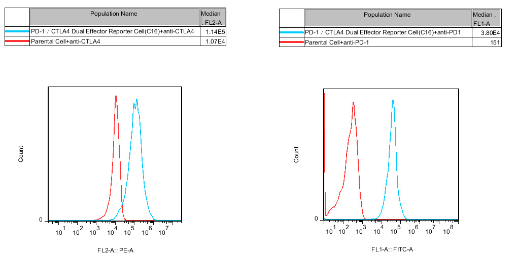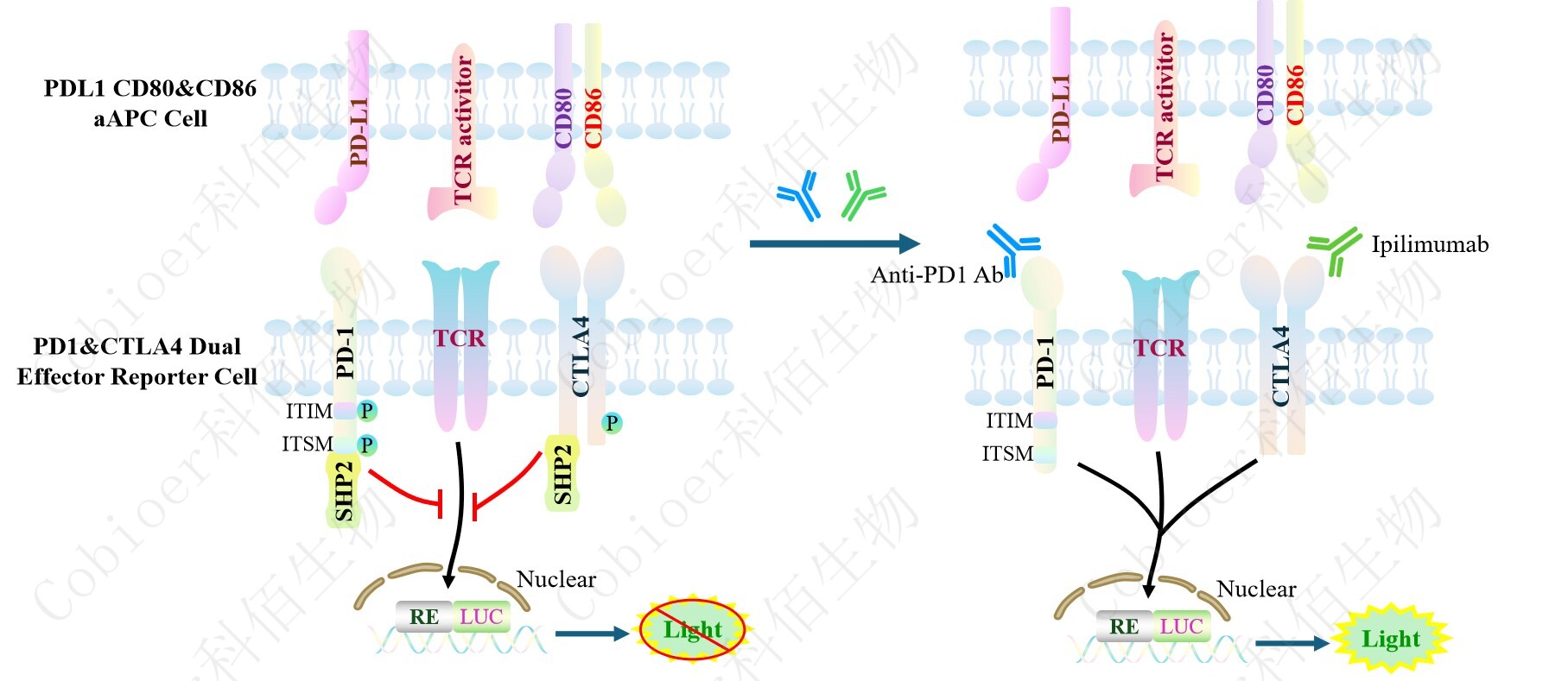 PD1&CTLA4 Dual Effector Reporter Cell 報 告 基 因 藥 靶 模 型 很 好 的 模 擬 了 體 內(nèi) PD1&CTLA4 的信號轉(zhuǎn)導(dǎo)過程,原理見下圖所示。