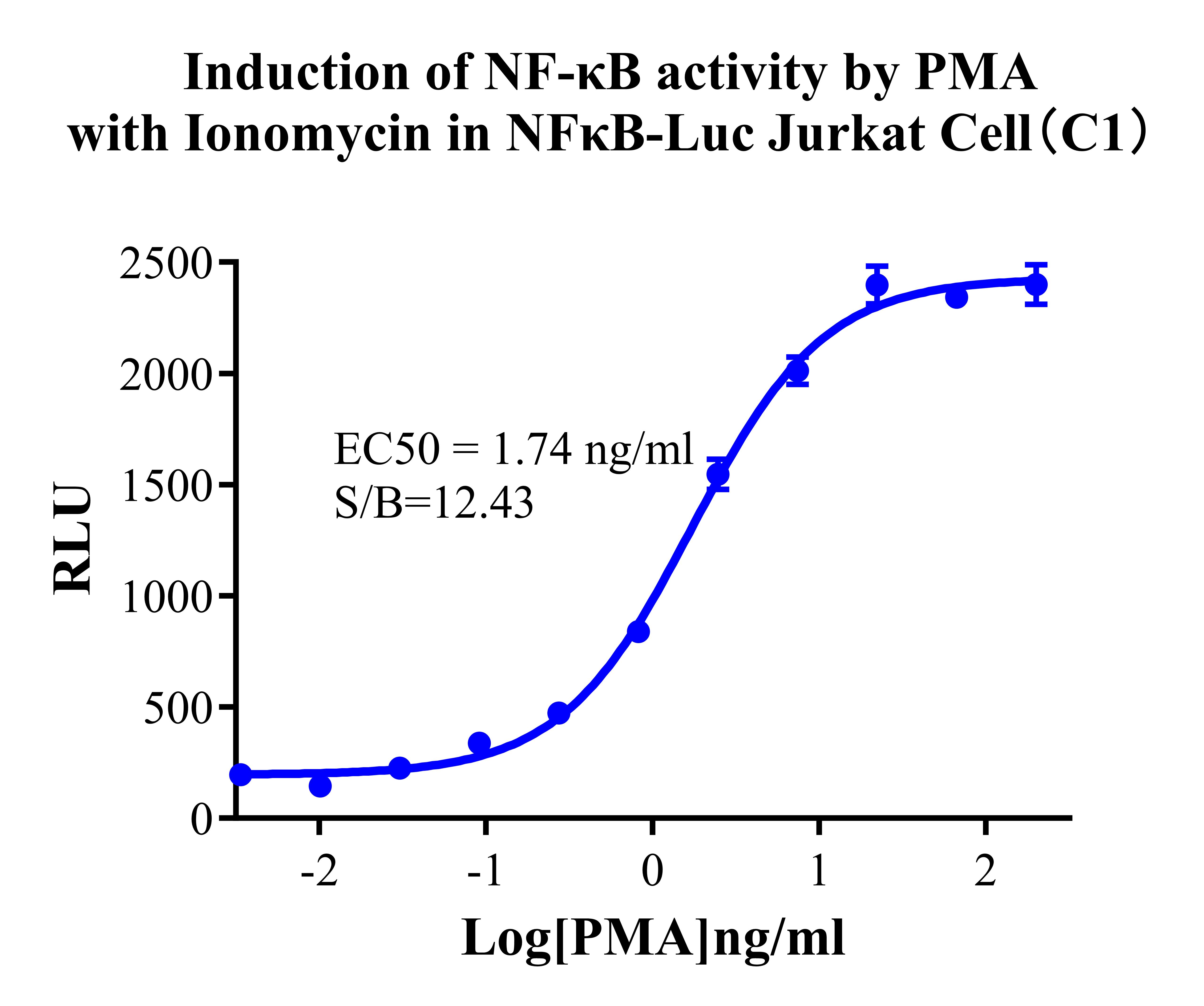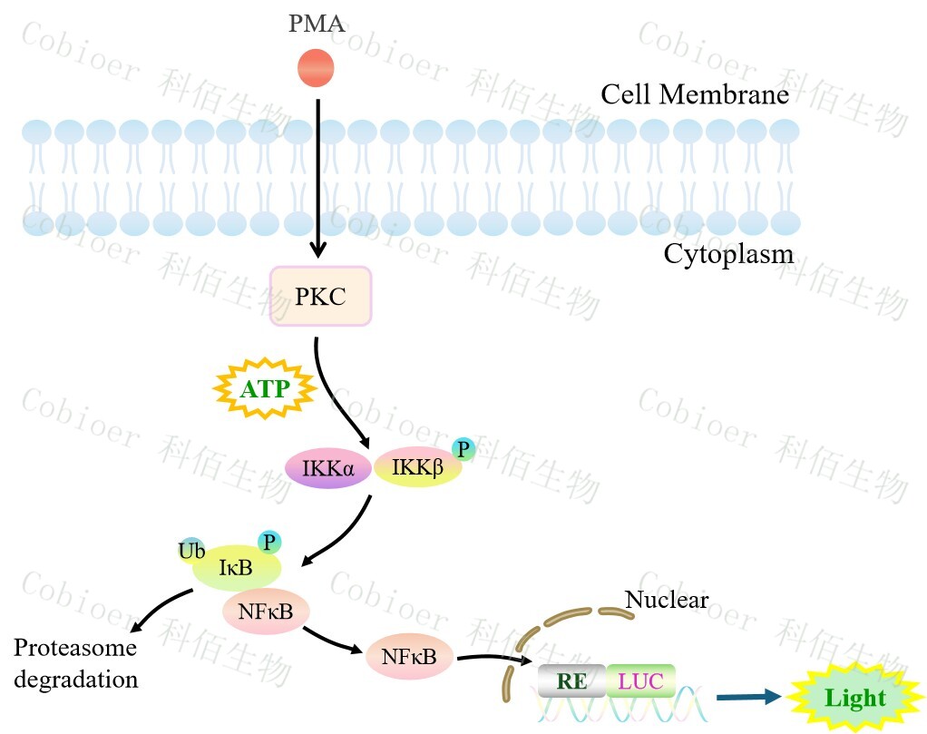 NFκB-Luc Jurkat 報告基因細(xì)胞是由 NFκB 調(diào)控并表達(dá) Luc 熒光素酶報 告基因的 Jurkat細(xì)胞。PMA 是 DAG(二酯酰甘油)的類似物,可自由的通過細(xì)胞膜,直接 作用于細(xì)胞活化信號轉(zhuǎn)導(dǎo)通路上的 PKC,原理見下圖所示。![]() Figure 1:NFκB-Luc Jurkat 細(xì)胞模型原理圖