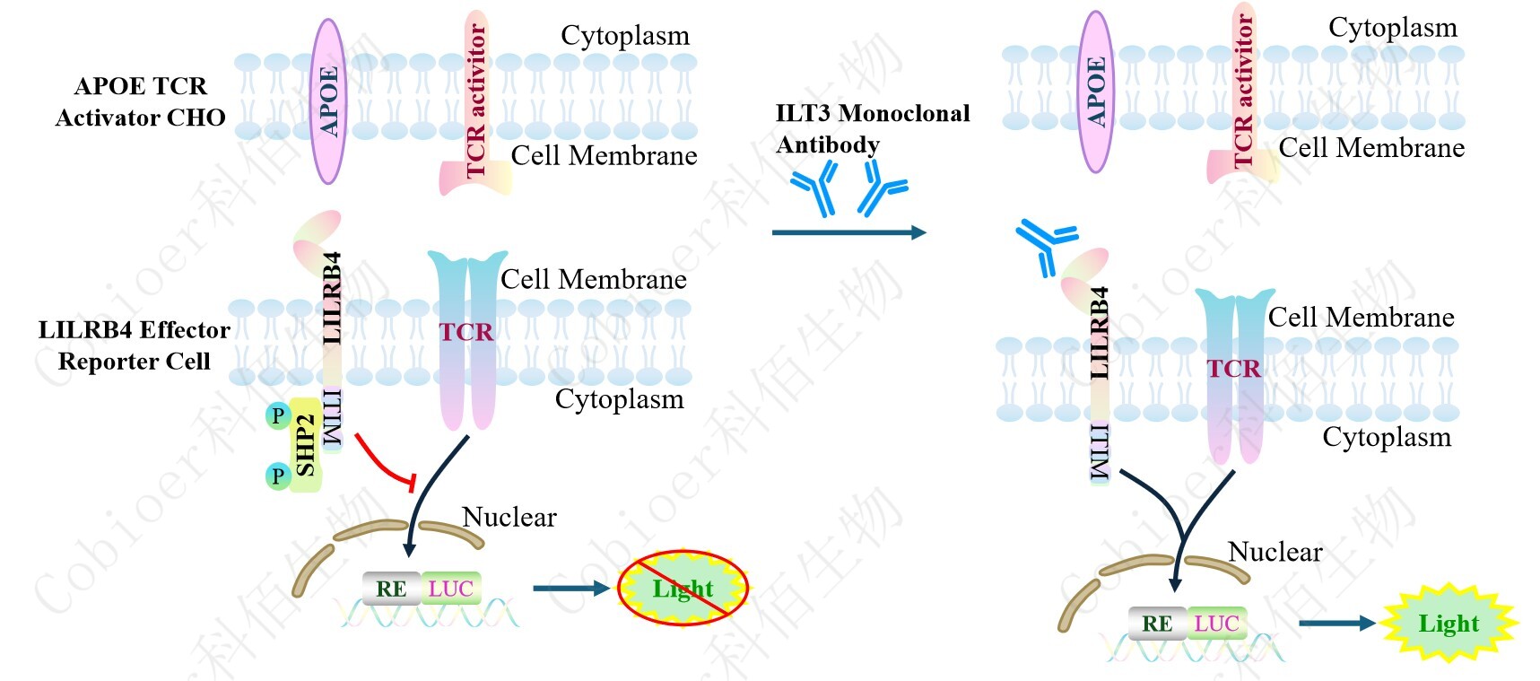 APOE TCR Activator CHO 作為 LILRB4 Effector Reporter Cell 的靶細胞,很好的模擬了 體內 LILRB4 的信號轉導過程,原理見下圖所示。![]() Figure 1. APOE TCR Activator CHO 模型原理圖 |