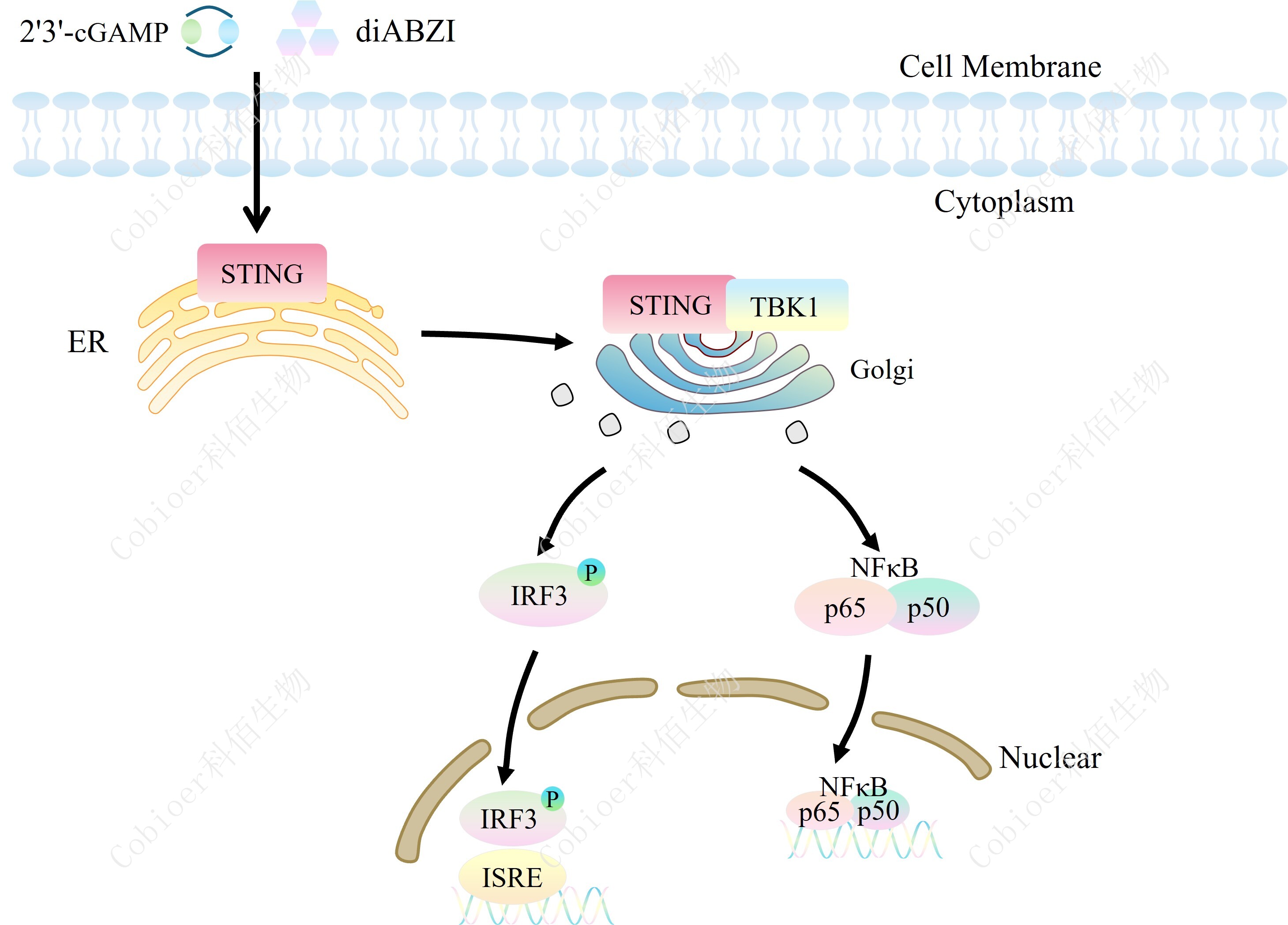 STING(干擾素基因刺激因子)又稱 MPYS、TMEM173、MITA 和 ERIS,是一種跨膜蛋白,是環(huán)狀二核苷酸(CDN)的直接傳感器。CDN 是細(xì)菌信號(hào)轉(zhuǎn)導(dǎo)中普遍存在的第二信使分子,是哺乳動(dòng)物細(xì)胞的防御觸發(fā)器。當(dāng)細(xì)菌病原體攻擊時(shí),釋放到細(xì)胞中的 CDN 直接與 STING 結(jié)合,激活的 STING 和 TANK 結(jié)合激酶-I (TBK1) 相互作用以誘導(dǎo)活性干擾素調(diào)節(jié)因子 (IRF3) 二聚體,然后該二聚體與細(xì)胞核中的干擾素刺激反應(yīng)元件 (ISRE) 結(jié)合并導(dǎo)致 IFN-α/β 的產(chǎn)生。IFNβ 的產(chǎn)生是 STING 活化的標(biāo)志。腫瘤微環(huán)境(TME)中由于天然免疫產(chǎn)生的信號(hào)傳導(dǎo)是導(dǎo)致腫瘤特異性 T 細(xì)胞激活和腫瘤浸潤性淋巴細(xì)胞(TIL)浸潤的關(guān)鍵因素。其中尤其以 I 型 IFN 對腫瘤特異性 T 細(xì)胞的活化最為關(guān)鍵。因此,STING 激動(dòng)劑可以通過誘導(dǎo)Ⅰ型干擾素基因的表達(dá),激活包括樹突狀細(xì)胞等免疫刺激細(xì)胞,改變腫瘤微環(huán)境并誘導(dǎo)腫瘤特異性 T 細(xì)胞的產(chǎn)生,從而通過調(diào)節(jié)免疫系統(tǒng)達(dá)到抗腫瘤的目的。 | |