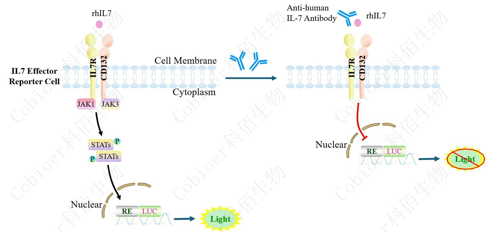 IL7 Effector Reporter Cell 報(bào)告基因藥靶模型很好的模擬了體內(nèi) IL7 的信號(hào)轉(zhuǎn)導(dǎo)過程,原理見下圖所示。![]() Figure 1. IL7 Effector Reporter Cell 模型原理圖 |