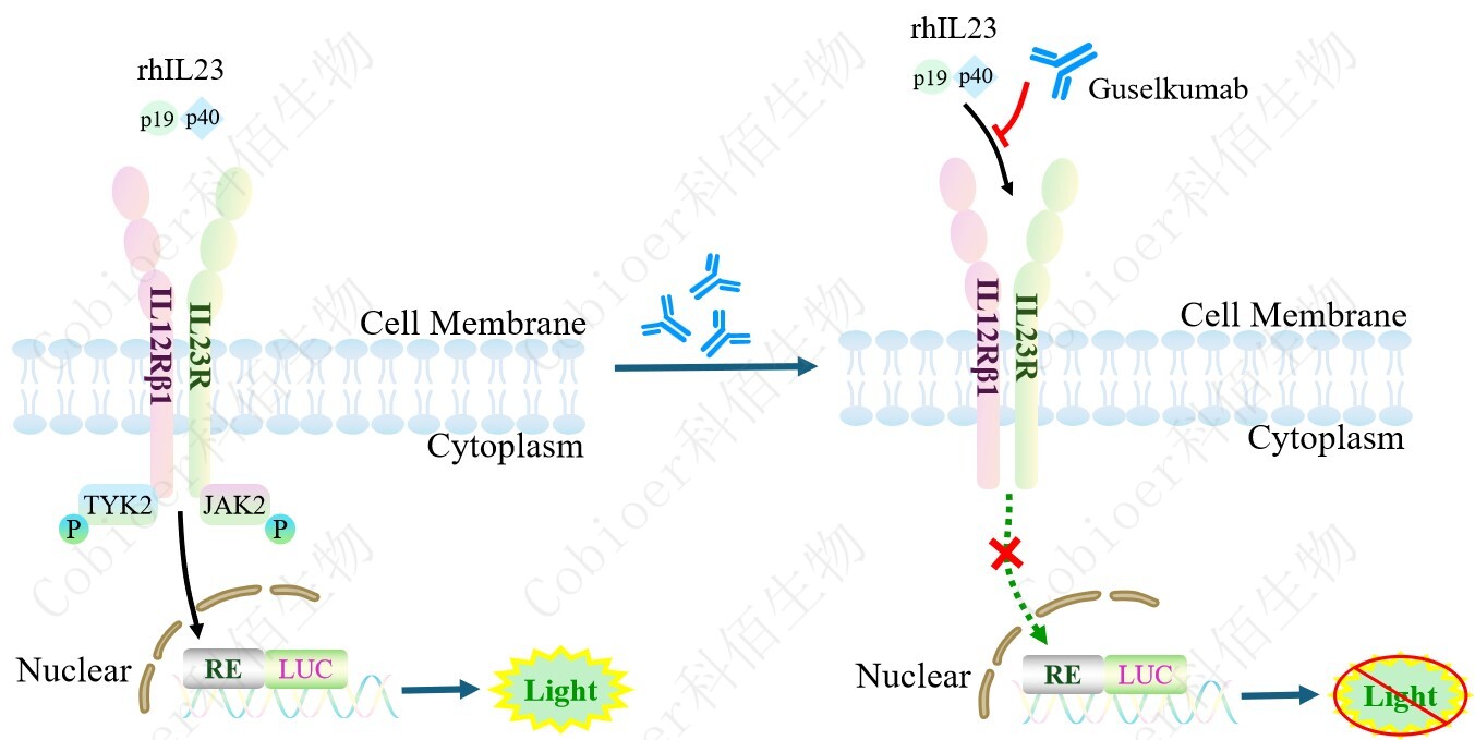 IL23 Effector Reporter Cell 報告基因藥靶模型很好的模擬了體內(nèi) IL23 的信號轉(zhuǎn)導(dǎo)過程, 原理見下圖所示。 ![]() Figure 1. IL23 Effector Reporter Cell 細(xì)胞模型原理圖