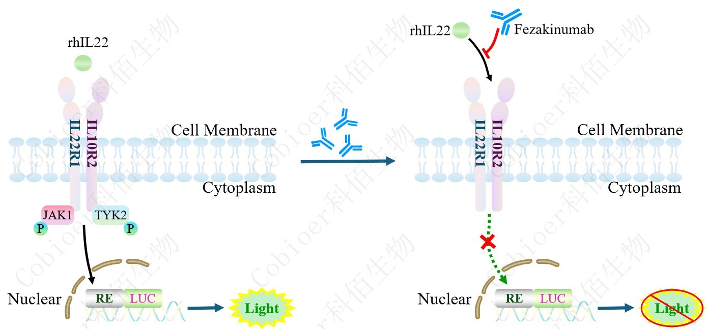 IL22 Effector Reporter Cell 報告基因藥靶模型很好的模擬了體內 IL22 的信號轉導過程, 原理見下圖所示。![]() Figure 1. IL22 Effector Reporter Cell 細胞模型原理圖 |