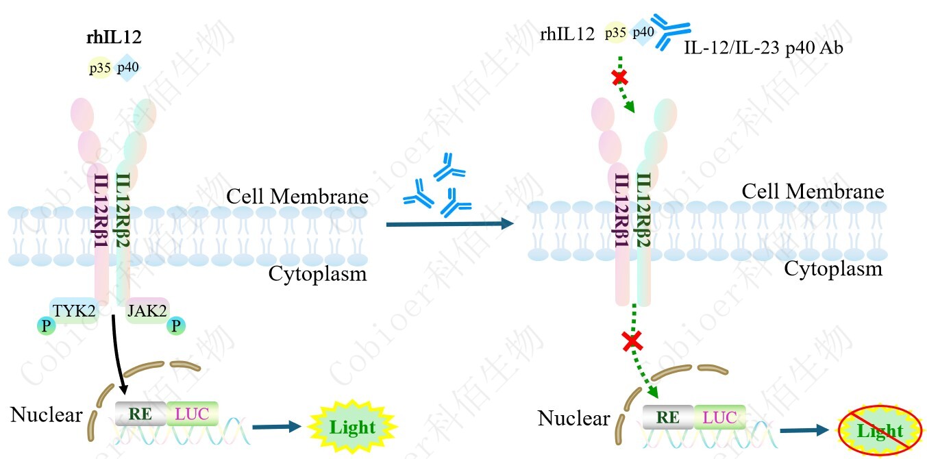 IL12 Effector Reporter Cell 報(bào)告基因藥靶模型很好的模擬了體內(nèi) IL12 的信號(hào)轉(zhuǎn)導(dǎo)過程, 原理見下圖所示。 ![]() Figure 1. IL12 Effector Reporter Cell 細(xì)胞模型原理圖 |