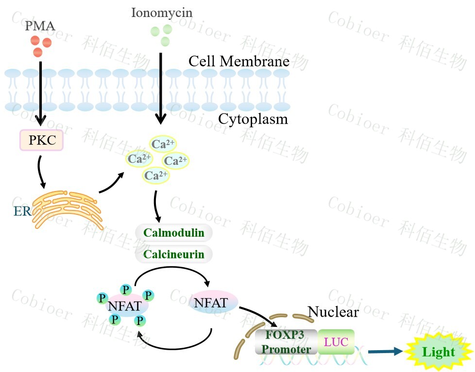 FOXP3 promoter-Luc Jurkat 報(bào)告基因細(xì)胞,是由 FOXP3 調(diào)控并表達(dá) Luc 熒光素酶報(bào)告基因的 Jurkat 細(xì)胞。PMA 是 DAG(二酯酰甘油)的類(lèi)似物,可自由的通過(guò) 細(xì)胞膜,可用于測(cè)定 CD3/CD28 介導(dǎo)的 T 細(xì)胞活化,原理見(jiàn)下圖所示。 Figure 1. FOXP3 promoter-Luc Jurkat 細(xì)胞模型原理圖 |
