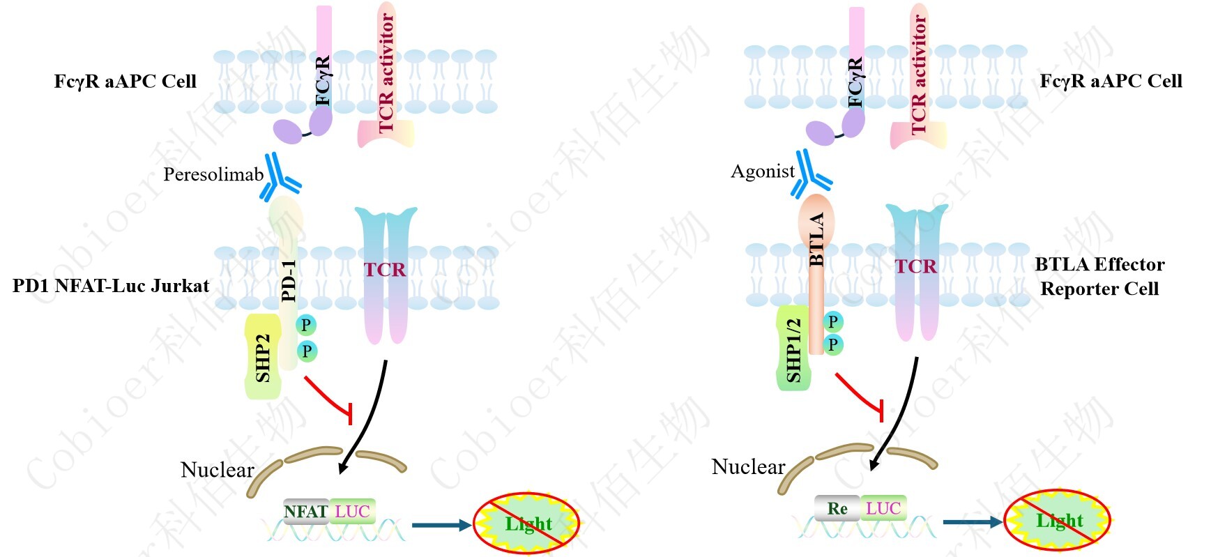 FcγR aAPC Cell在基礎(chǔ)細胞上穩(wěn)定表達 FcγR 和 aAPC。FcγR aAPC Cell 作為 PD1 NFAT-Luc Jurkat Cell/BTLA Effector Reporter Cell 的靶細胞進行功能檢測的原 理圖見下圖所示。