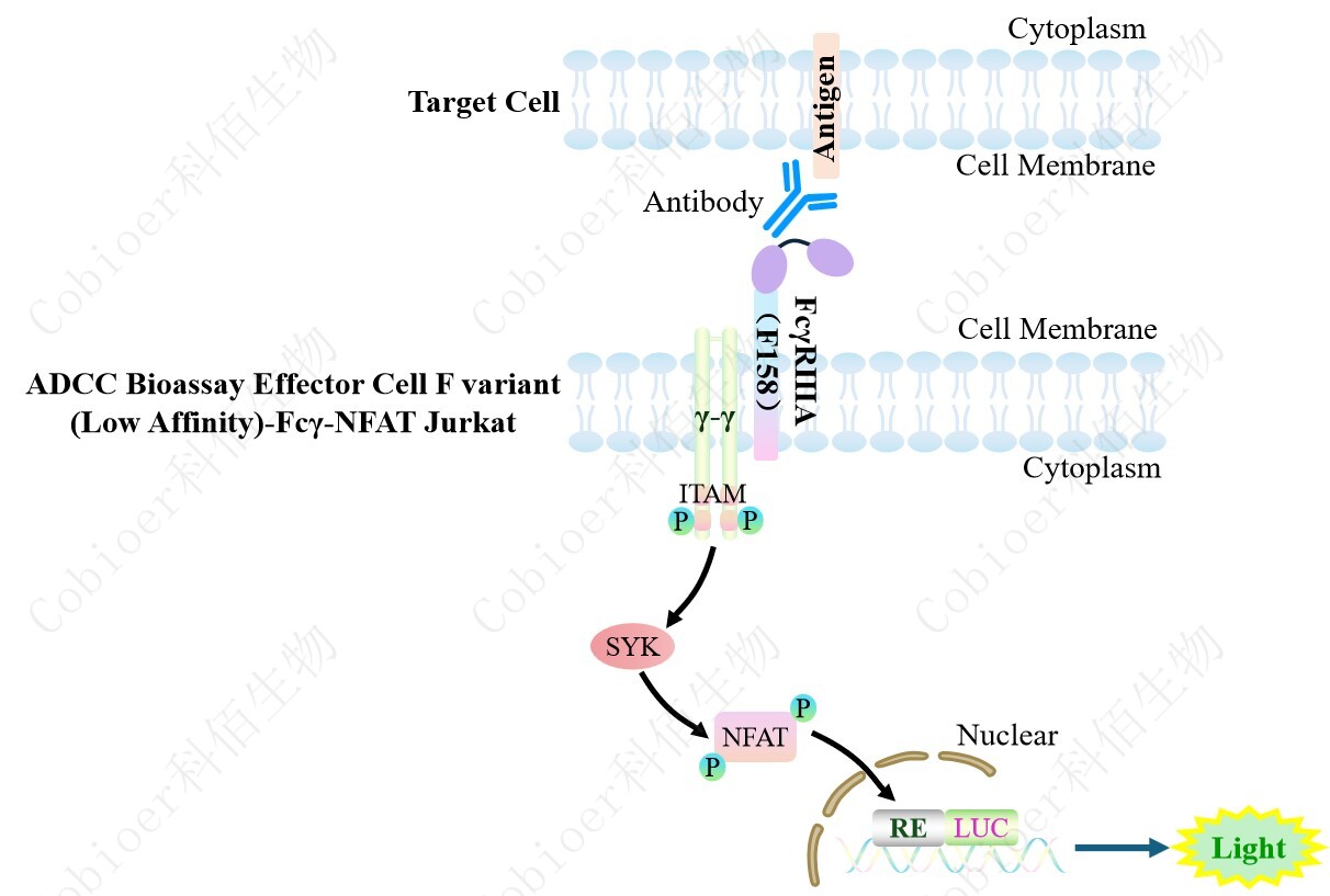 ADCC Bioassay Effector Cell F variant (Low Affinity)-Fcγ-NFAT Jurkat 報(bào)告基因藥靶模型 很好的模擬了體內(nèi) ADCC 的信號(hào)轉(zhuǎn)導(dǎo)過程,原理見下圖所示。
