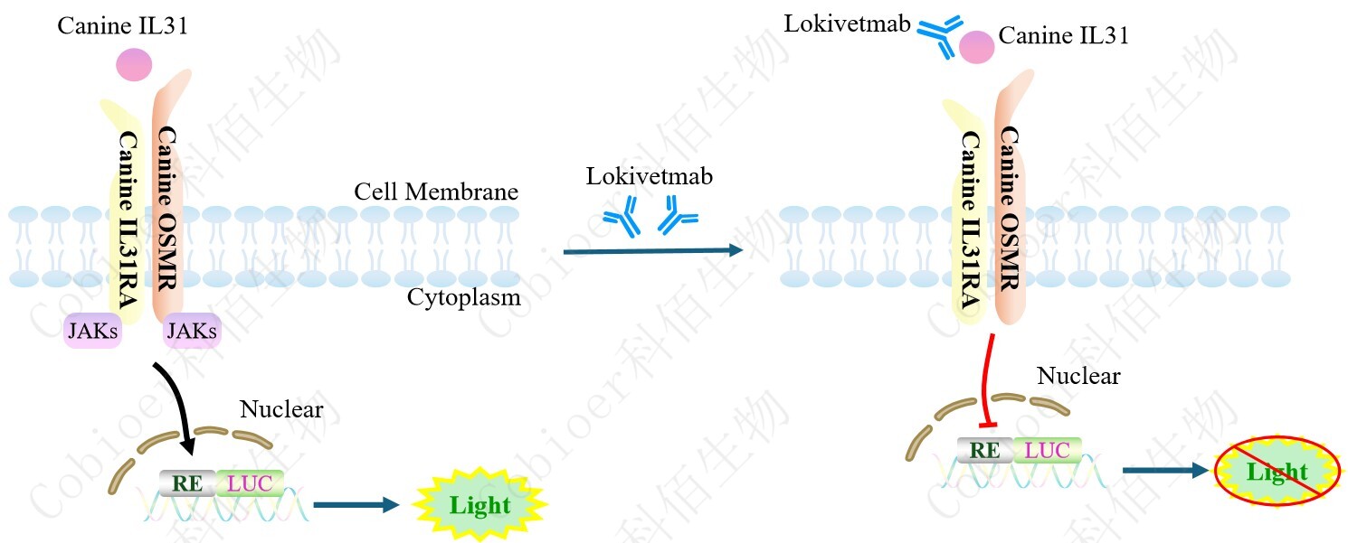 Canine IL31 Effector Reporter 報告基因藥靶模型很好的模擬了體內 IL31 的信號轉導過 程,原理見下圖所示。