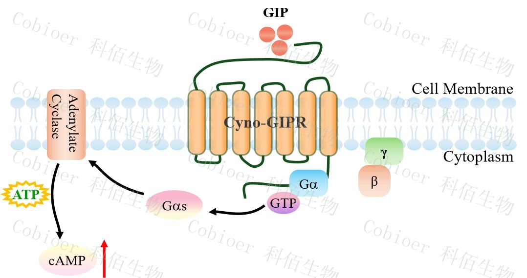 cAMP 在 G 蛋白偶聯(lián)受體(GPCR)信號轉(zhuǎn)導中是一種關(guān)鍵的第二信使。當配體結(jié)合到 GPCR,構(gòu)象發(fā)生變化,激活受體接著激活G蛋白,Gs的激活導致腺苷酸環(huán)化酶調(diào)控cAMP 的升高。GIPR 藥靶模型很好的模擬了體內(nèi) GIPR 的信號轉(zhuǎn)導過程,原理見下圖所示。