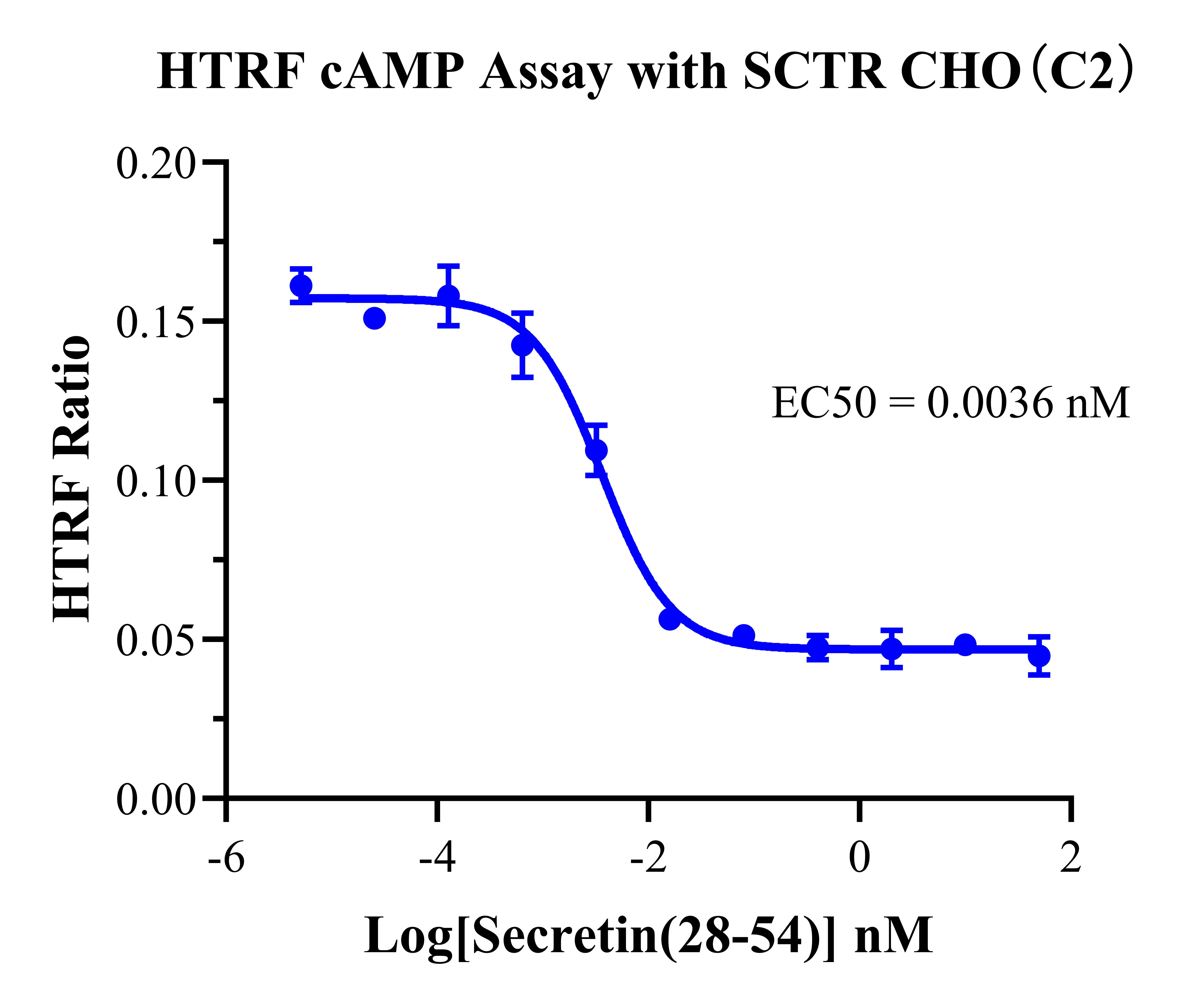 cAMP 在 G 蛋白偶聯(lián)受體(GPCR)信號轉(zhuǎn)導中是一種關鍵的第二信使。當配體結(jié)合到 GPCR, 構象發(fā)生變化,激活受體接著激活 G 蛋白,Gs 的激活導致腺苷酸環(huán)化酶調(diào)控 cAMP 的升高。 SCTR 藥靶模型很好的模擬了體內(nèi) SCTR 的信號轉(zhuǎn)導過程,原理見下圖所示。 |