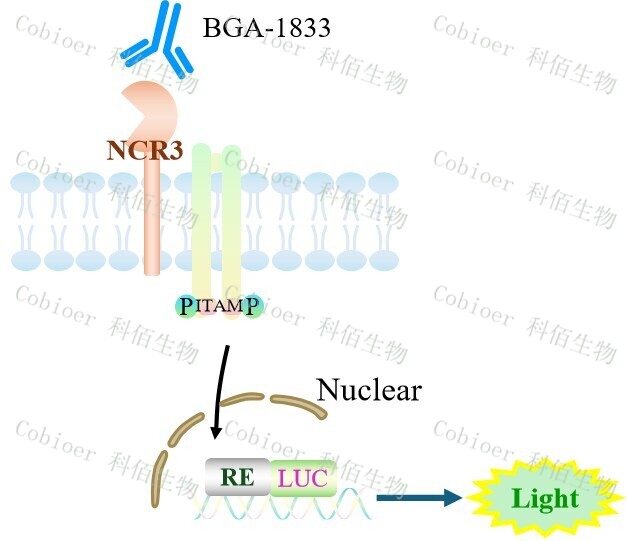 NCR3(NKp30) Effector Reporter 報告基因藥靶模型很好的模擬了體內(nèi) NKp30 的信號 轉(zhuǎn)導過程,原理見下圖所示。![]() Figure 1. NCR3(NKp30) Effector Reporter 細胞模型原理圖 |