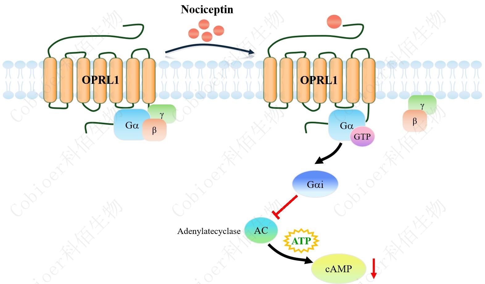 阿片受體家族包括κ-阿片受體(KOP)、 δ-阿片受體(DOP)、µ-阿片受體(MOP) 和痛覺(jué)肽阿片受體(NOP),均屬于 G 蛋白偶聯(lián)受體,主要通過(guò)偶聯(lián)下游 Gi 蛋白發(fā)揮功 能。NOP 也被稱為痛覺(jué)肽/孤兒蛋白 FQ (N/OFQ)受體或 kappa- 3 型阿片受體,是一種由 OPRL1 基因編碼的蛋白質(zhì)。痛覺(jué)肽受體是 G 蛋白偶聯(lián)受體阿片亞家族的一員,其天然配體 是 17 個(gè)氨基酸的神經(jīng)肽,稱為痛覺(jué)肽(N/OFQ)。阿片相關(guān)痛覺(jué)肽受體 1 (OPRL1)廣泛表達(dá) 于中樞神經(jīng)系統(tǒng),包括海馬齒狀回、皮質(zhì)區(qū)、紋狀體、丘腦和下丘腦。 |
