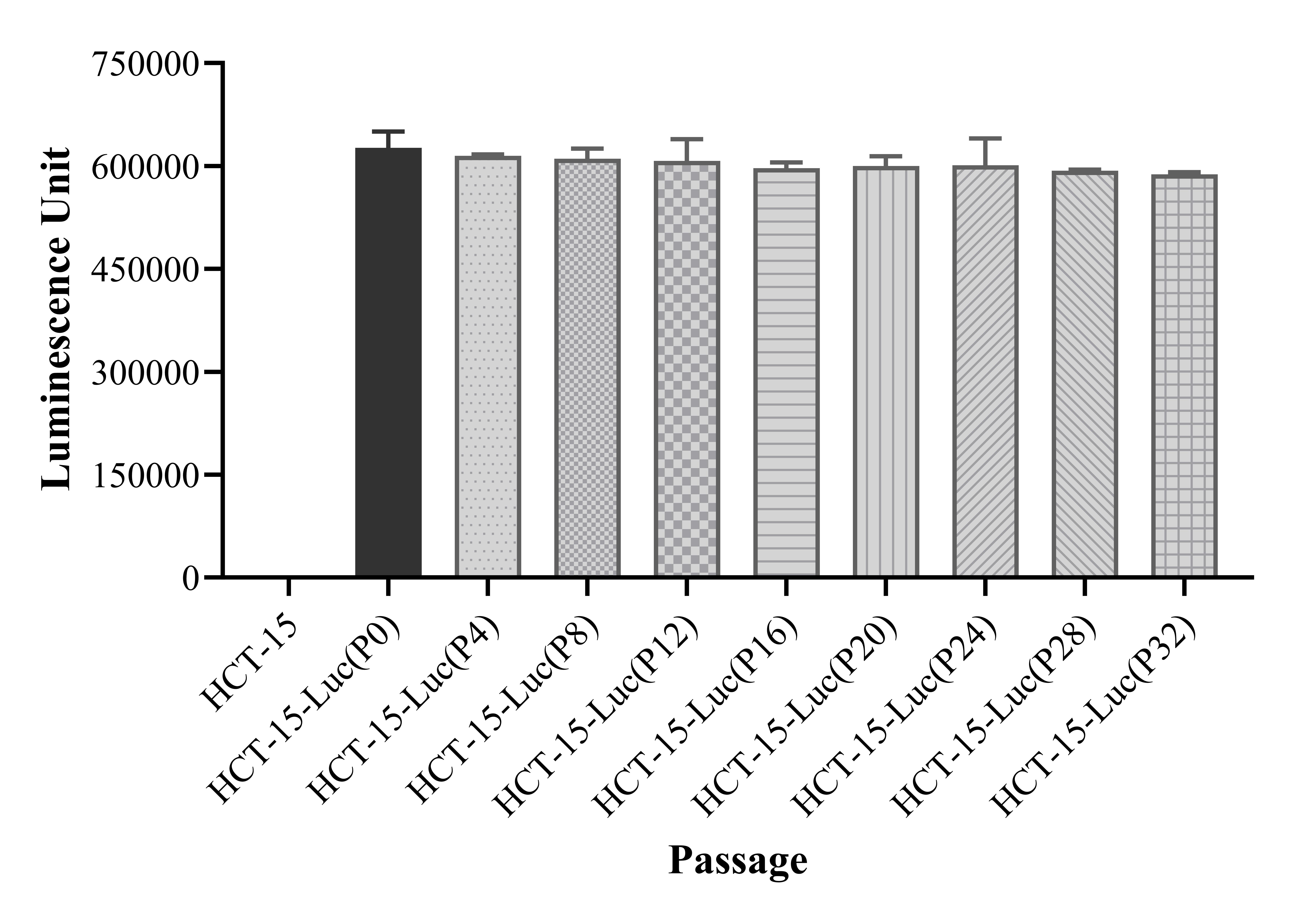 Figure 1. Stablity test results. HCT-15-Luc showed at least 32 passage stability with similar luminescence unit.