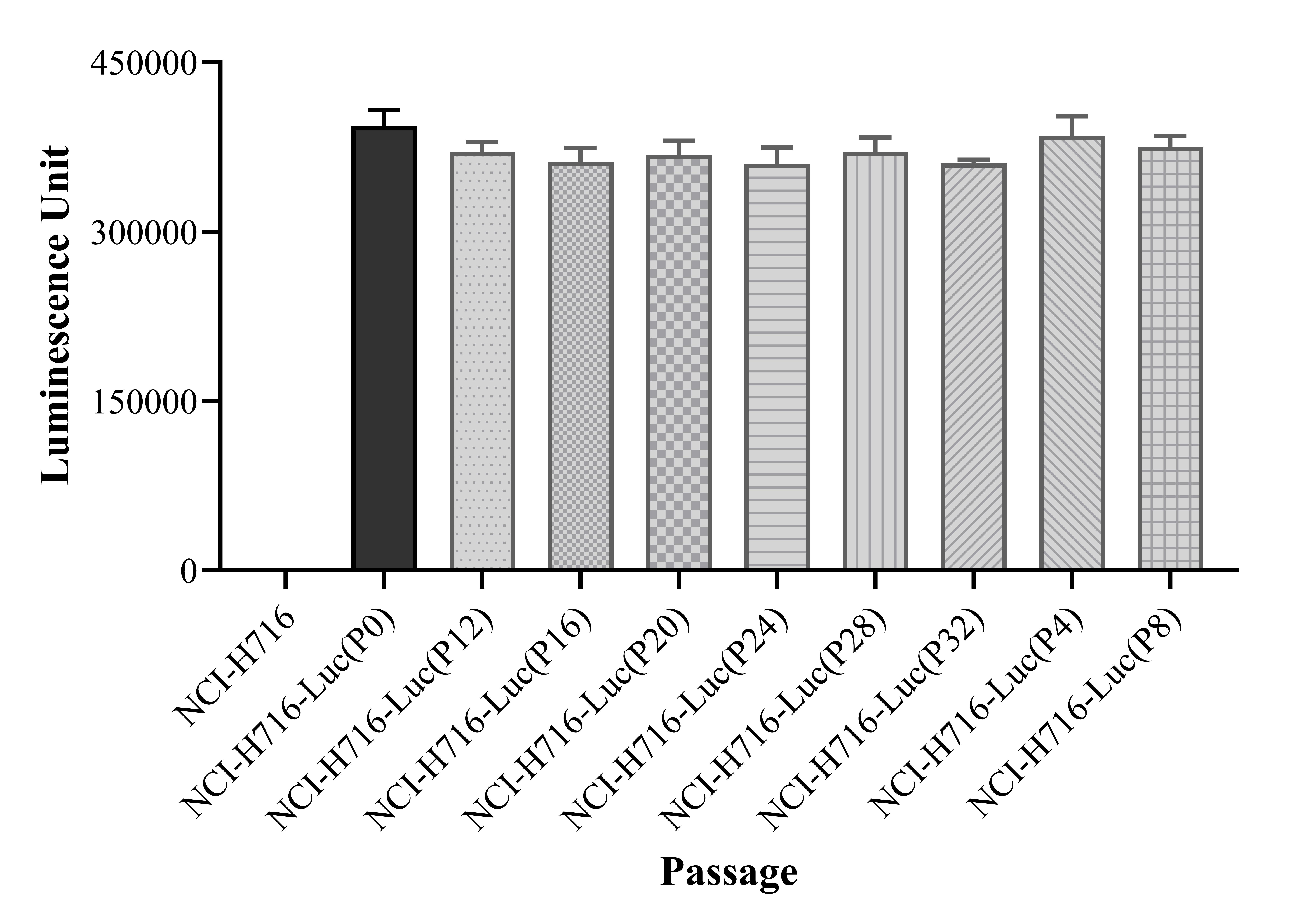 Figure 1. Stablity test results. NCI-H716-Luc showed at least 32 passage stability with similar luminescence unit.
