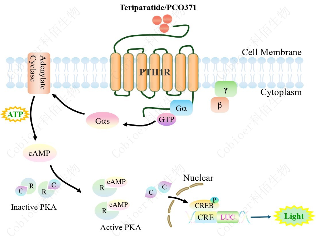 PTH1R CRE-Luc HEK293 報告基因藥靶模型很好的模擬了體內 PTH1R 的信號轉導過程,原理見下圖所示。 ![]() Figure 1. PTH1R CRE-Luc HEK293 細胞模型原理圖 |