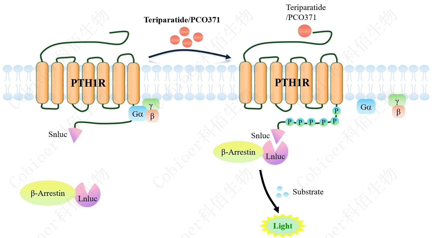 PTH1R β-Arrestin CHO PTH1R β-Arrestin CHO 報告基因藥靶模型很好的模擬了體內(nèi) PTH1R/β-Arrestin 的信號 轉(zhuǎn)導(dǎo)過程,原理見下圖所示。當(dāng)缺乏配體刺激時,β-Arrestin 不與 PTH1R 結(jié)合,融合β- Arrestin 的熒光素酶處于失活構(gòu)象,當(dāng) PTH1R 遭遇配體刺激時,融合熒光素酶報告基因的 β-Arrestin 被招募,使熒光素酶報告基因處于激活狀態(tài),加入其底物后發(fā)光信號增強(qiáng)。 ![]() Figure 1. PTH1R β-Arrestin CHO 細(xì)胞模型原理圖 |