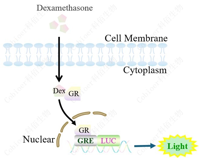 GRE-Luc A549 報告基因細(xì)胞,是由 GRE 調(diào)控并表達(dá) Luc 熒光素酶報告 基 因的 A549 細(xì) 胞。 Dexamethasone (Hexadecadrol, 地 塞米 松)是 糖皮質(zhì)激素受體 (Glucocorticoid Receptor)激動劑、凋亡誘導(dǎo)劑,原理見下圖所示。![]() Figure 1. GRE-Luc A549 細(xì)胞原理示意圖 |