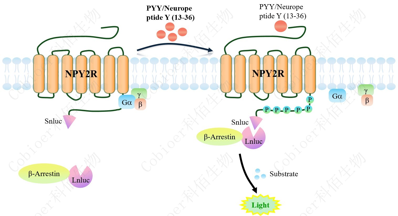 NPY2R β-Arrestin CHO 報告基因藥靶模型很好的模擬了體內(nèi) NPY2R/β-Arrestin 的信號 轉(zhuǎn)導(dǎo)過程,原理見下圖所示。當(dāng)缺乏配體刺激時,β-Arrestin 不與 NPY2R 結(jié)合,融合β- Arrestin 的熒光素酶處于失活構(gòu)象,當(dāng) NPY2R 遭遇配體刺激時,融合熒光素酶報告基因的β-Arrestin 被招募,使熒光素酶報告基因處于激活狀態(tài),加入其底物后發(fā)光信號增強(qiáng)。