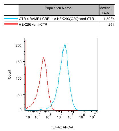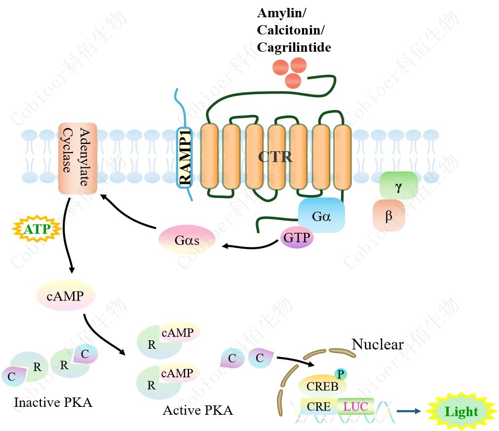 CTR&RAMP1 CRE-Luc HEK293 報告基因藥靶模型很好的模擬了體內(nèi) CTR&RAMP1 的信號轉(zhuǎn)導(dǎo)過程,原理見下圖所示。![]() Figure 1. CTR&RAMP1 CRE-Luc HEK293 細(xì)胞模型原理圖 |