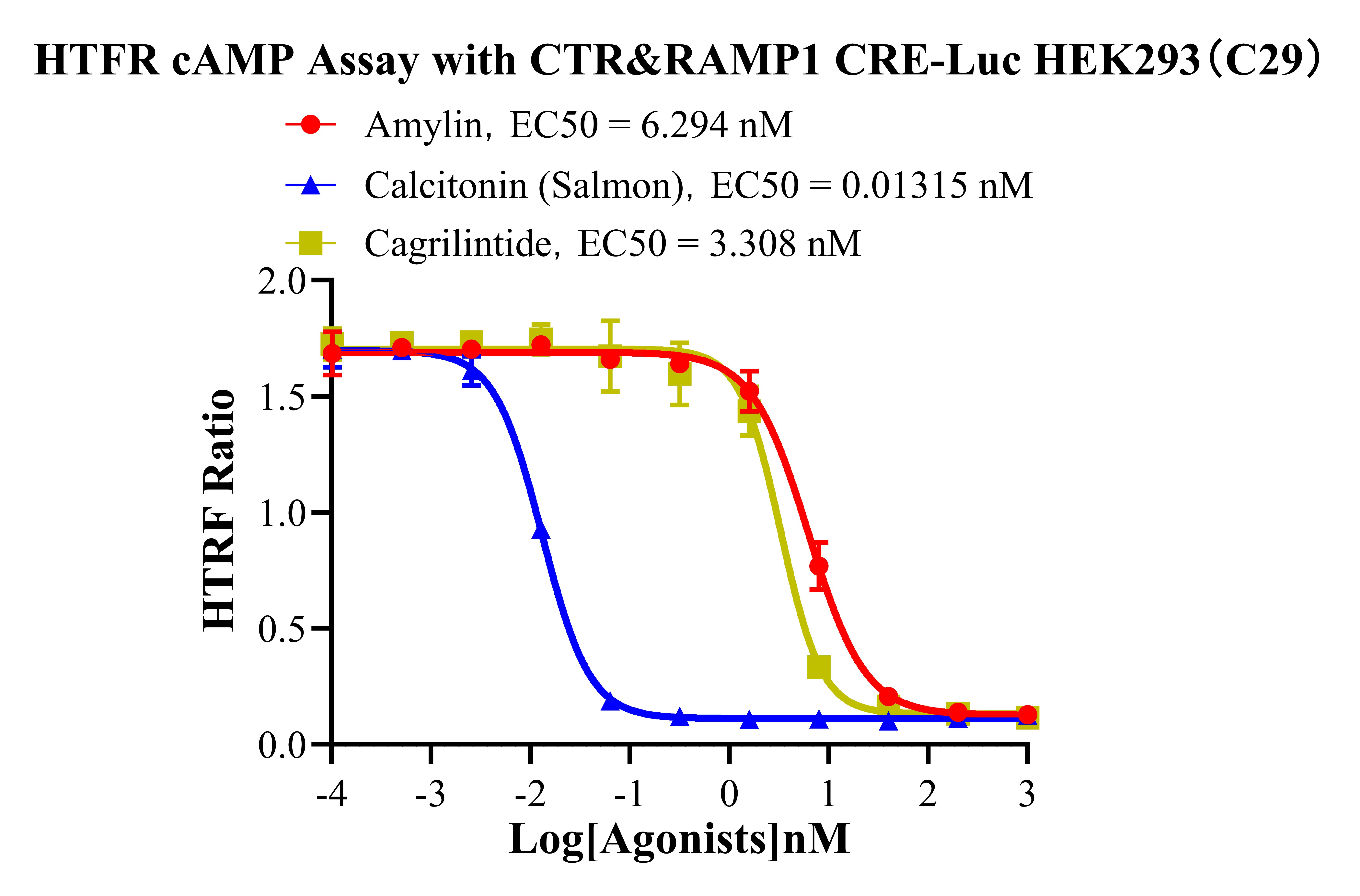 V. Representative Data![]() Figure 2. WB of CTR&RAMP1 CRE-Luc HEK293. ![]() Figure 3. Recombinant CTR&RAMP1 CRE-Luc HEK293 stably expressing CTR&RAMP1. ![]() Figure 4. Detect Luciferase assay by Ultra Luciferase Detection Kit CBPH0001(we strongly suggest to purchase from Cobioer). Dose Response of CTR/RAMP1 Agonists in CTR&RAMP1 CRE-Luc HEK293 (C29). Figure 5. HTRF cAMP Assay with CTR&RAMP1 CRE-Luc HEK293 (C29). |