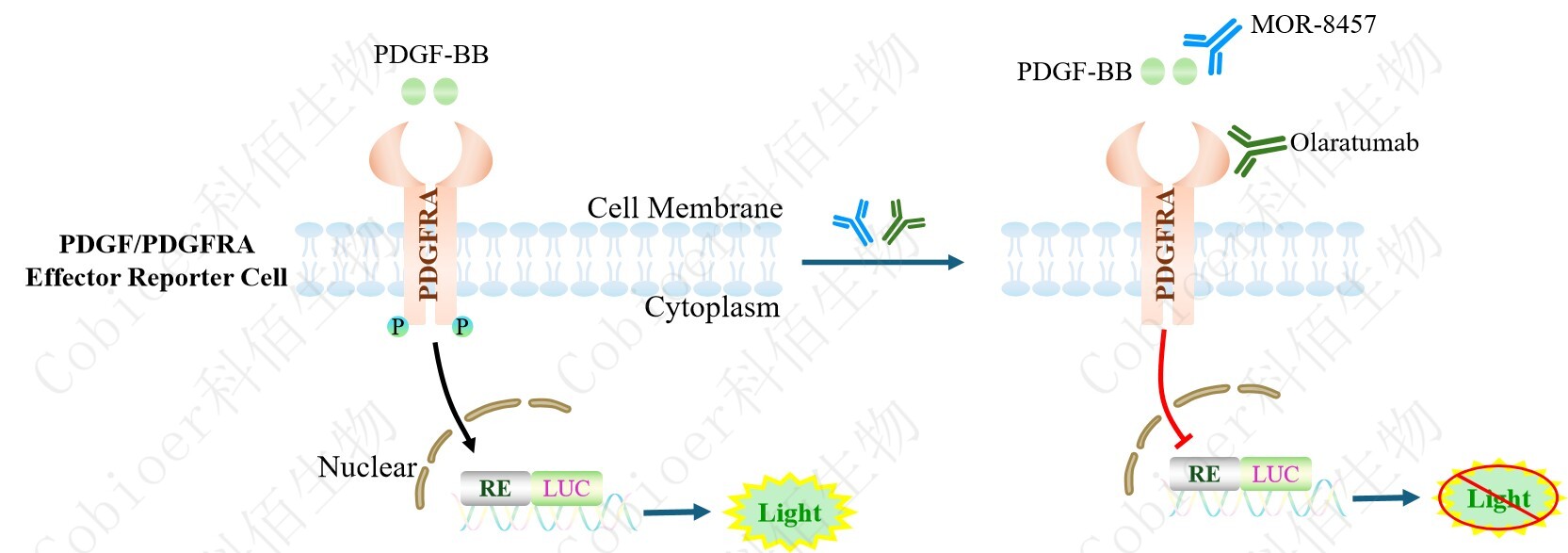 PDGF/PDGFRA Effector Reporter Cell 報(bào)告基因藥靶模型很好的模擬了體內(nèi) PDGFRA 的信號(hào)轉(zhuǎn)導(dǎo)過程,原理見下圖所示。
