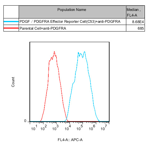 IV. Representative Data![]() Figure 2. Recombinant PDGF/PDGFRA Effector Reporter Cell stably expressing PDGFRA. ![]() Figure 3. Dose Response of Recombinant Human PDGF-BB in PDGF/PDGFRA Effector Reporter Cell(C53). ![]() Figure 4. Inhibition of Human PDGF-BB-induced Reporter Activity by PDGFB Neutralization Ab in PDGF/PDGFRA Effector Reporter Cell(C53). Inhibition of Human PDGF-BB-induced Reporter Activity by PDGFRA Blocking Ab in PDGF/DGFRA Effector Reporter Cel(C53). |