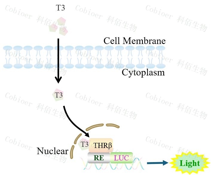 THRB Luciferase Reporter HEK293,是由 THRB 調(diào)控并表達(dá) Luc 熒光素 酶報(bào)告基因的 HEK293 細(xì)胞。甲狀腺激素(T3/T4)是一種有效的甲狀腺激素,主要通過結(jié) 合 TRs 發(fā)揮作用,調(diào)控基因表達(dá)和細(xì)胞功能,原理見下圖所示。![]() Figure 1. THRB Luciferase Reporter HEK293 原理示意圖
