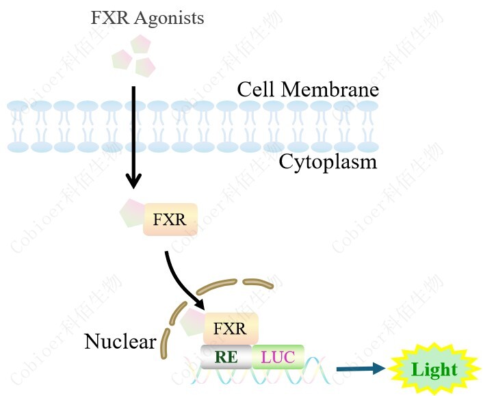 FXR Reporter Cell 報告基因細(xì)胞,在由調(diào)控因子調(diào)控并表達(dá)報告基因的 重組細(xì)胞上,穩(wěn)定表達(dá)人 FXR。CDCA,GW4064 和 WAY-362450 是 FXR 的激活劑,原理見下圖所示。![]() Figure 1. FXR Reporter Cell 細(xì)胞原理示意圖 |