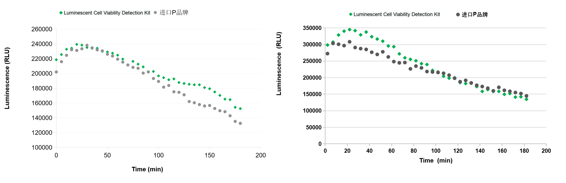 2. 半衰期 ![]() Figure 3. 生物發(fā)光穩(wěn)定性的檢測。分別使用Luminescent Cell Viability Detection Kit和進口P公司同類對照對2萬個/孔CTLL-2細胞(左圖)和5萬個/孔UC-MSC細胞(右圖)進行持續(xù)3小時的生物發(fā)光強度檢測。