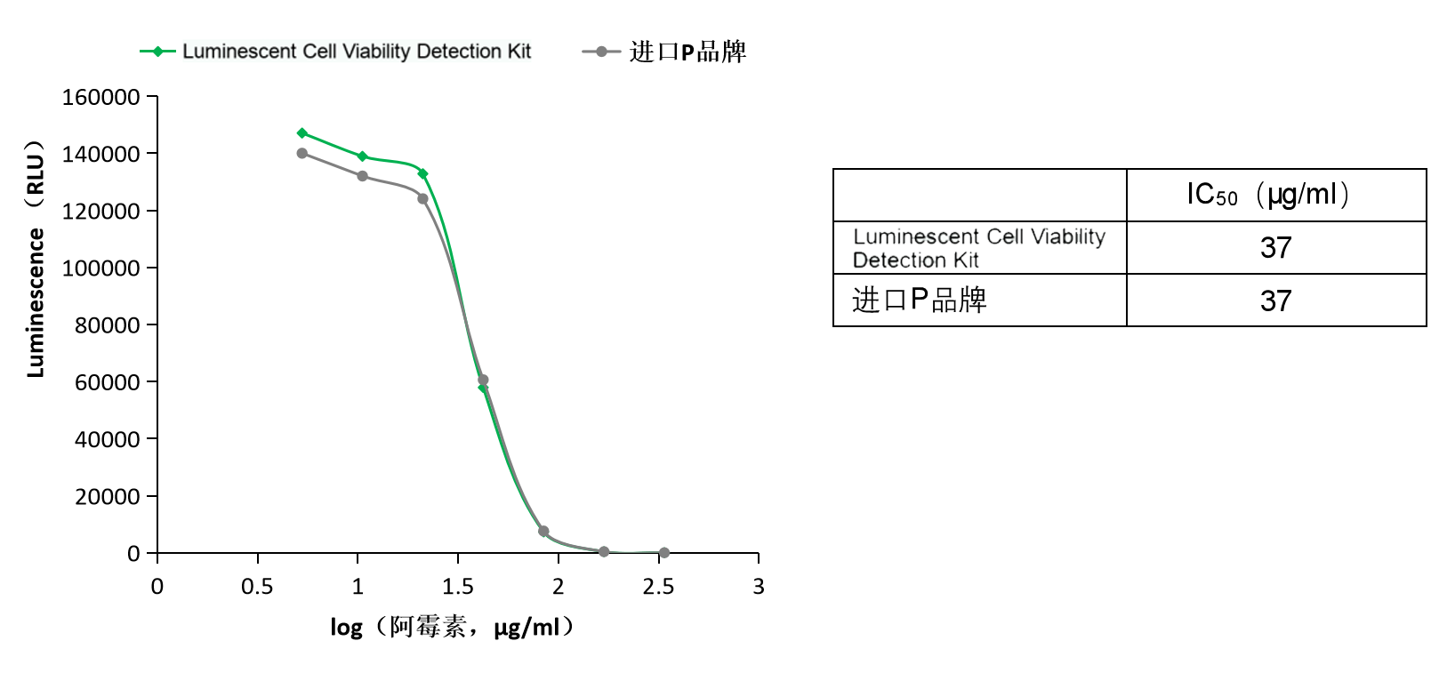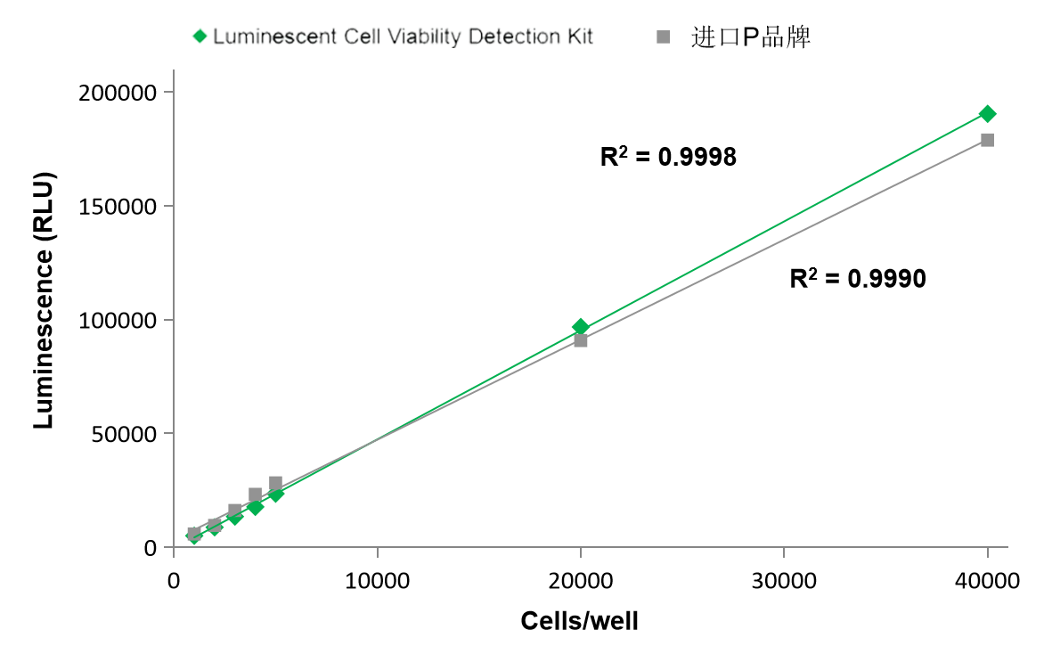3. 線性 ![]() Figure 4. 比較不同細胞數(shù)的線性范圍。分別使用Luminescent Cell Viability Detection Kit和進口P公司同類對照檢測不同數(shù)量CHO-K1細胞(CD-CHO培養(yǎng)基)在黑色96孔板中生物發(fā)光強度,制成標準曲線。