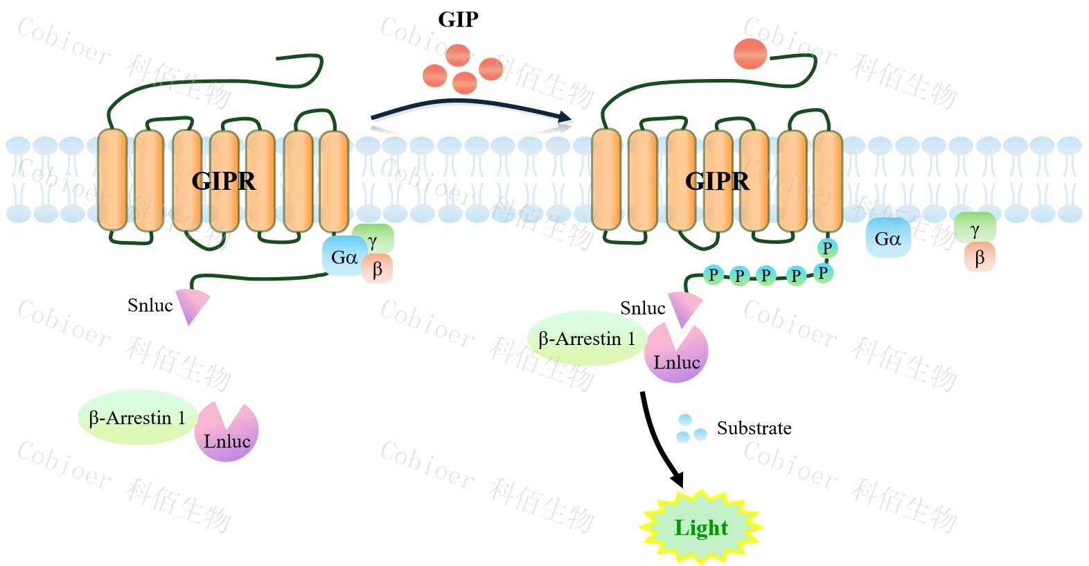 GIPR β-Arrestin 1 CHO 報(bào)告基因藥靶模型很好的模擬了體內(nèi) GIPR/β-Arrestin 1 的信號(hào) 轉(zhuǎn)導(dǎo)過(guò)程,原理見(jiàn)下圖所示。當(dāng)缺乏配體刺激時(shí),β-Arrestin 1 不與 GIPR 結(jié)合,融合β- Arrestin 1 的熒光素酶處于失活構(gòu)象,當(dāng) GIPR 遭遇配體刺激時(shí),融合熒光素酶報(bào)告基因的 β-Arrestin 1 被招募,使熒光素酶報(bào)告基因處于激活狀態(tài),加入其底物后發(fā)光信號(hào)增強(qiáng)。![]() Figure 1. GIPR β-Arrestin 1 CHO 細(xì)胞模型原理圖 |