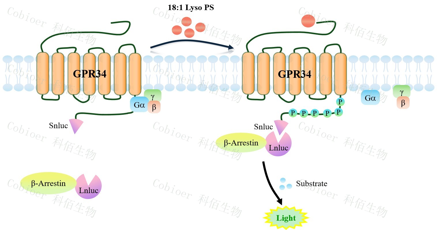 GPR34 β-Arrestin CHO 報(bào)告基因藥靶模型很好的模擬了體內(nèi) GPR34/β-Arrestin 的信號 轉(zhuǎn)導(dǎo)過程,原理見下圖所示。當(dāng)缺乏配體刺激時(shí),β-Arrestin 不與 GPR34 結(jié)合,融合β- Arrestin 的熒光素酶處于失活構(gòu)象,當(dāng) GPR34 遭遇配體刺激時(shí),融合熒光素酶報(bào)告基因的 β-Arrestin 被招募,使熒光素酶報(bào)告基因處于激活狀態(tài),加入其底物后發(fā)光信號增強(qiáng)。![]() Figure 1. GPR34 β-Arrestin CHO 細(xì)胞模型原理圖 |