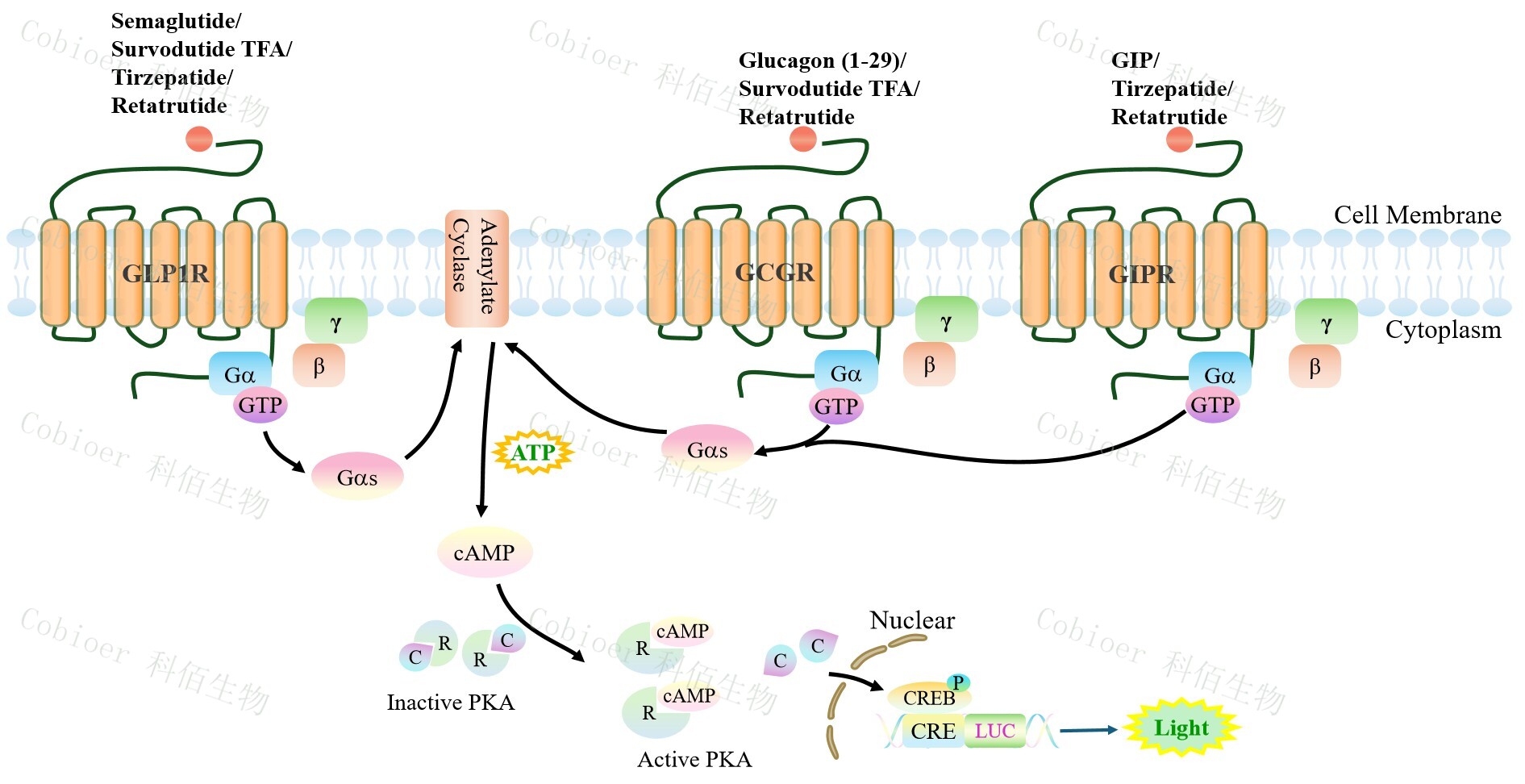 GLP1R&GCGR&GIPR Triple Reporter Cell 報(bào)告基因藥靶模型很好的模擬了體內(nèi)GLP1R&GCGR&GIPR 的信號(hào)轉(zhuǎn)導(dǎo)過程,原理見圖1 所 Figure 1. GLP1R&GCGR&GIPR Triple Reporter Cell 細(xì)胞模型原理圖