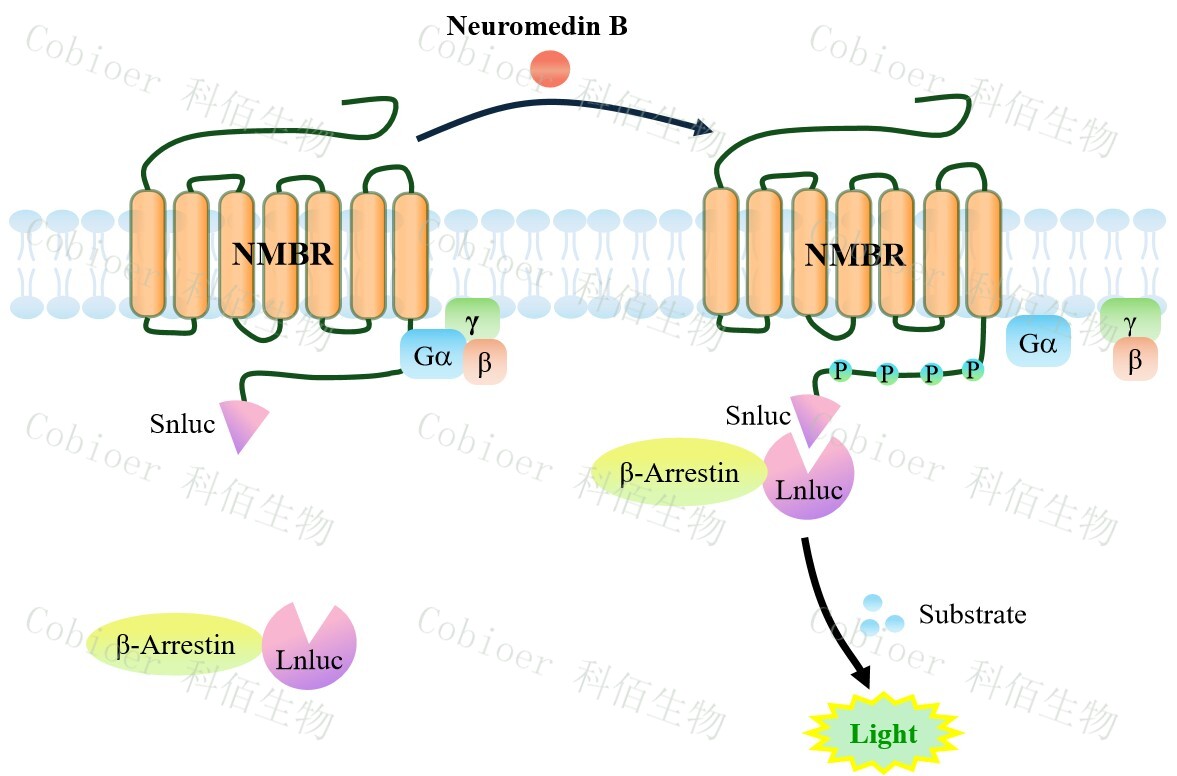 NMBR(BB1) β-Arrestin CHO 報(bào)告基因藥靶模型很好的模擬了體內(nèi) NMBR/β-Arrestin 的信號(hào)轉(zhuǎn)導(dǎo)過(guò)程,原理見(jiàn)下圖所示。當(dāng)缺乏配體刺激時(shí),β-Arrestin 不與 NMBR 結(jié)合,融合β- Arrestin 的熒光素酶處于失活構(gòu)象,當(dāng) NMBR 遭遇配體刺激時(shí),融合熒光素酶報(bào)告基因的 β-Arrestin 被招募,使熒光素酶報(bào)告基因處于激活狀態(tài),加入其底物后發(fā)光信號(hào)增強(qiáng)。![]() Figure 1. NMBR(BB1) β-Arrestin CHO 細(xì)胞模型原理圖 |