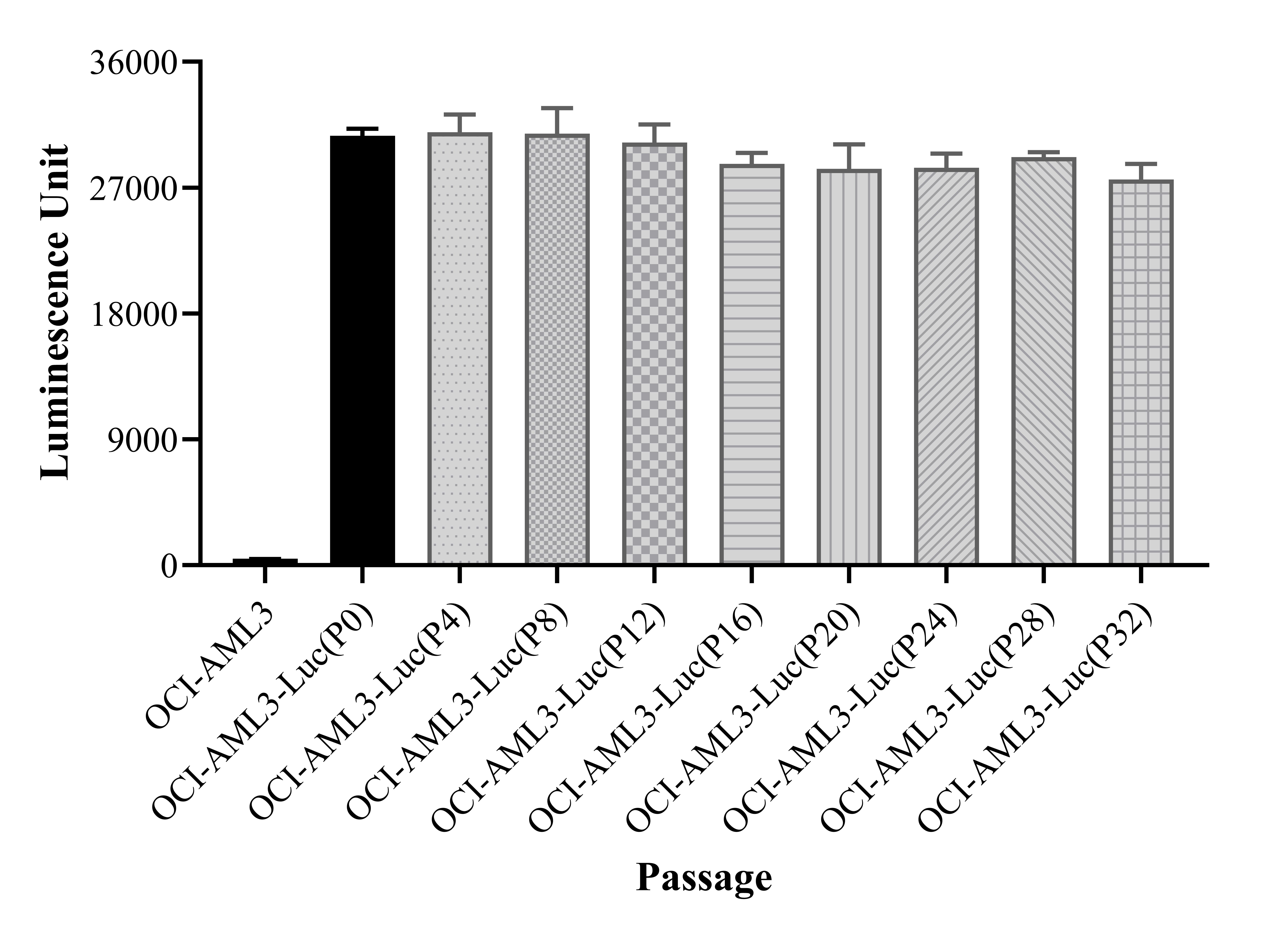 Figure 1. Stablity test results. OCI-AML3-Luc showed at least 32 passage stability with similar luminescence unit.
