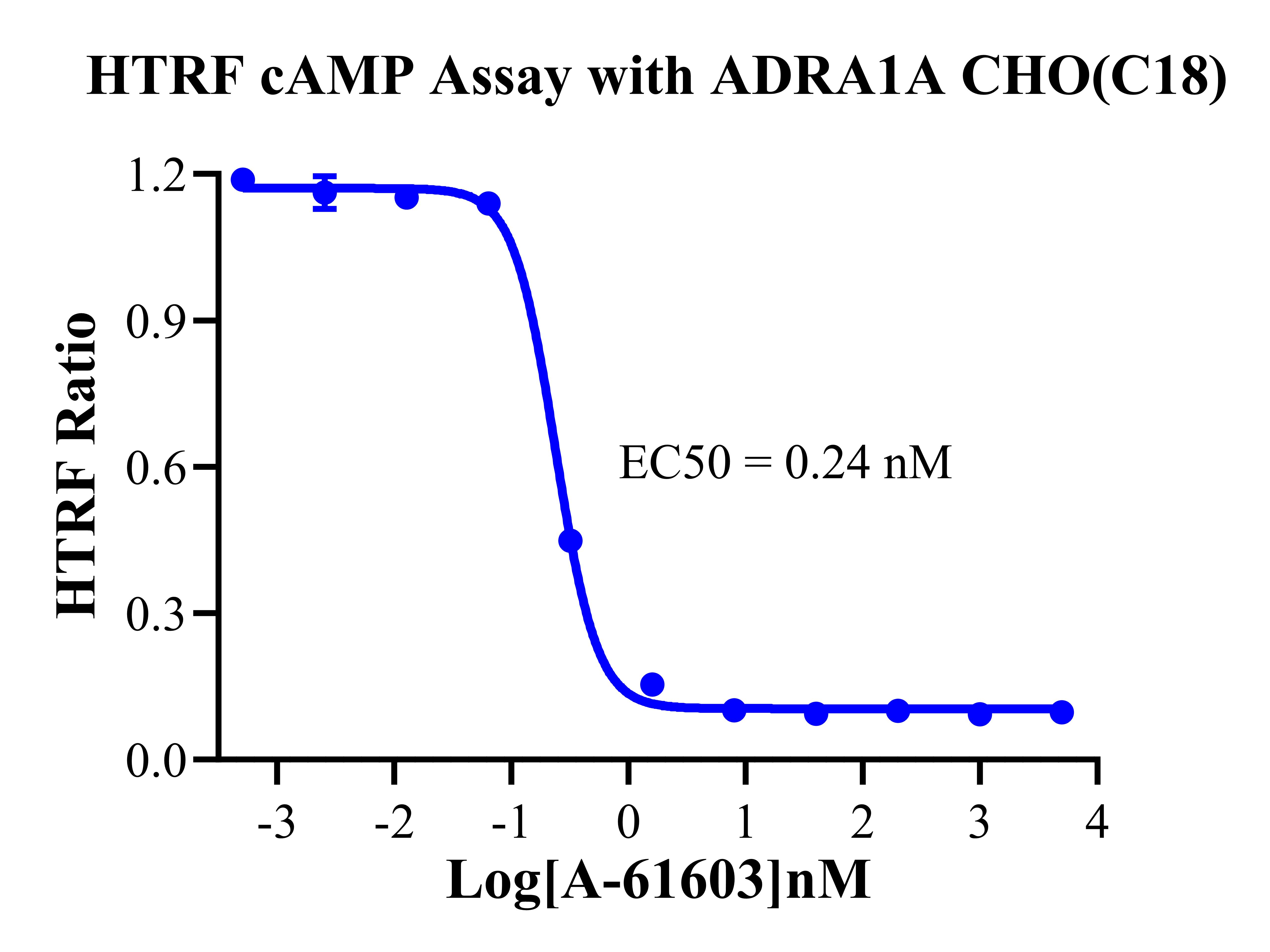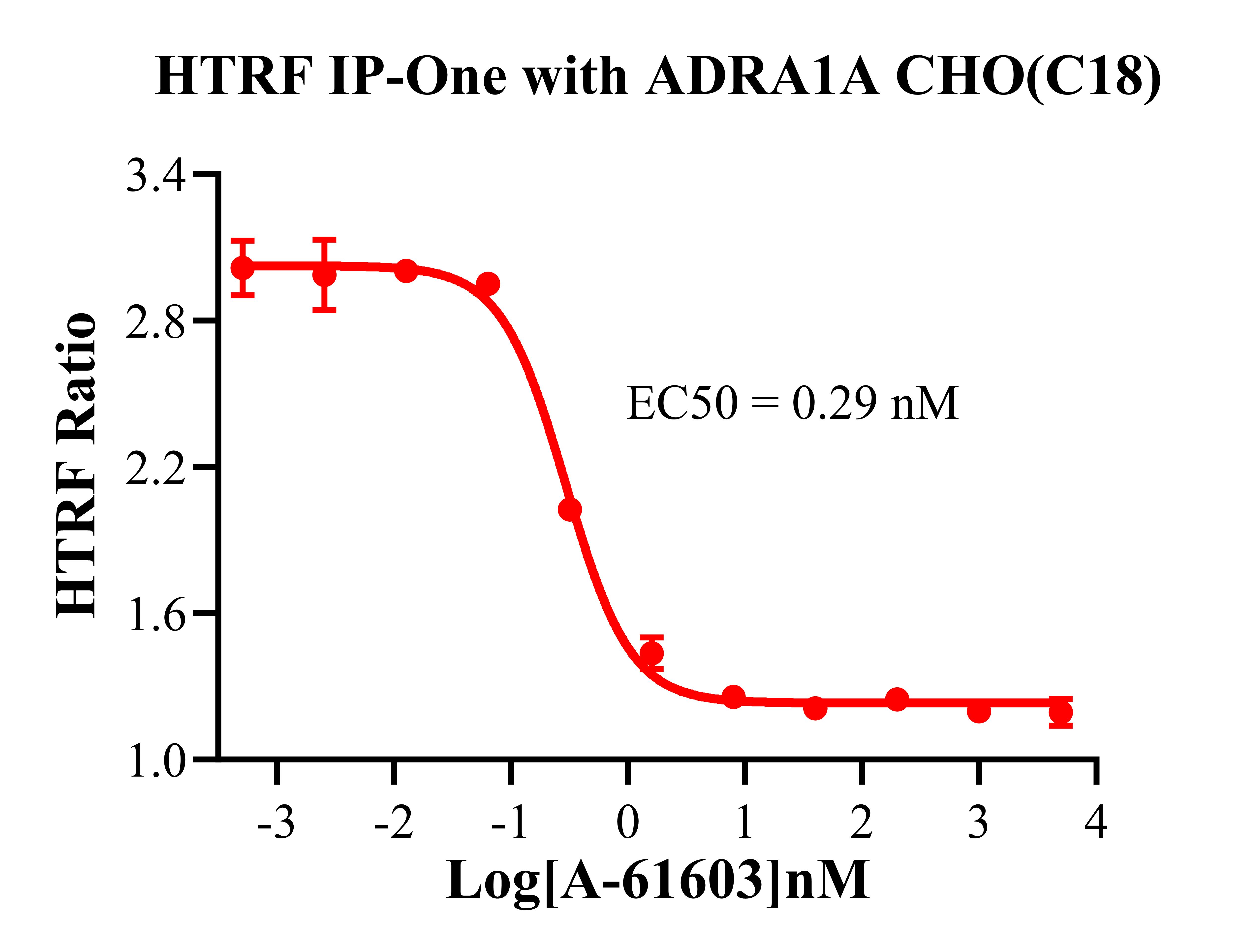 ADRA1A 還可以通過 Gq 蛋白的信號通路,調(diào)控 IP1 的升高。ADRA1A 與配體結(jié)合, 導(dǎo)致 Gαq 亞基的激活,觸發(fā) PLC-γ,從而產(chǎn)生兩個第二信使:IP3 和 DAG,它們參與細胞內(nèi)鈣動員。由于 IP3 在代謝上不穩(wěn)定,因此測量通路激活的替代標(biāo)志物 IP1 作為檢測標(biāo)準(zhǔn)。 Figure 1. ADRA1A CHO 細胞模型原理圖