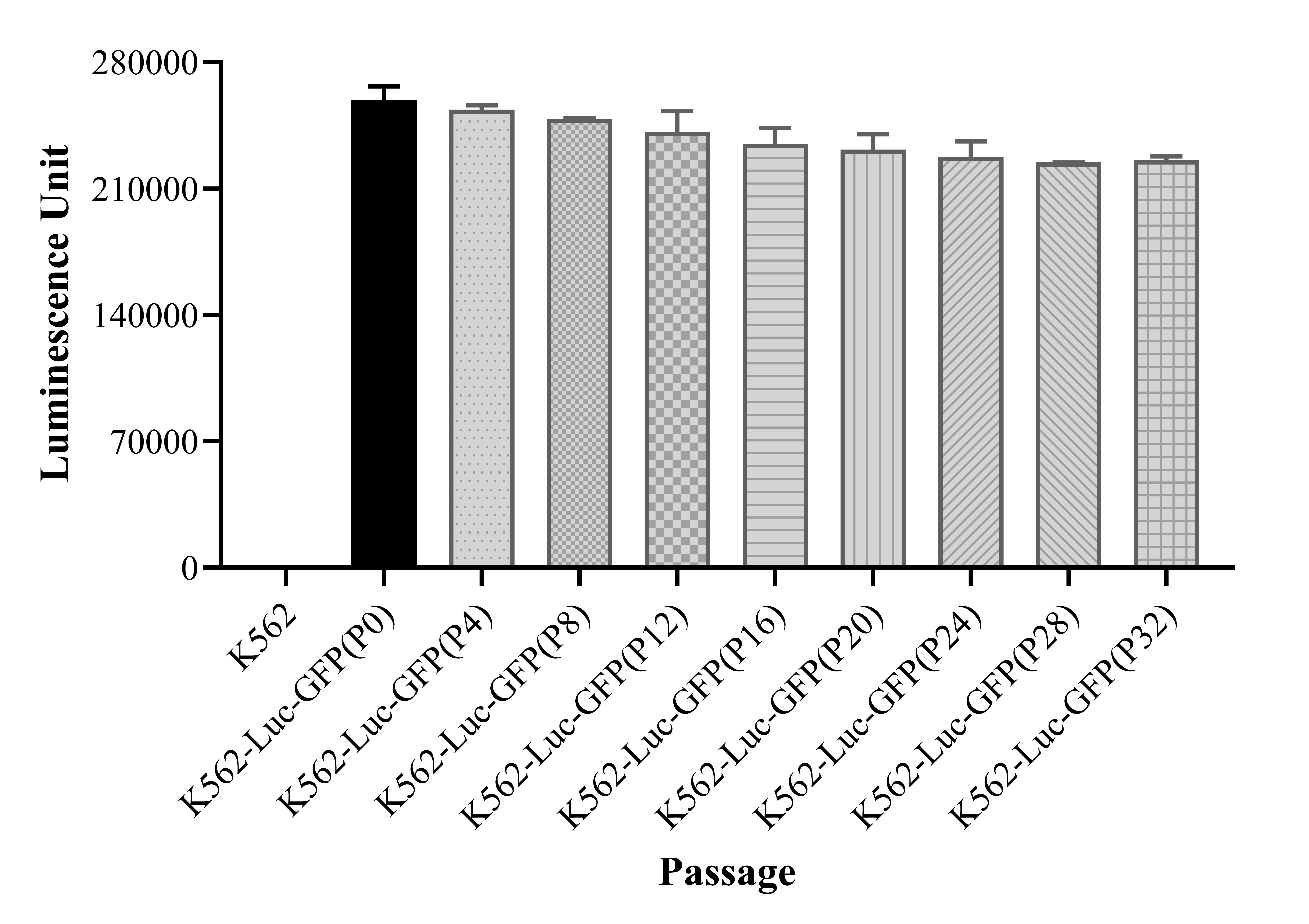 Figure 2. Stablity test results. K562-Luc-GFP showed at least 32 passage stability with similar luminescence unit.