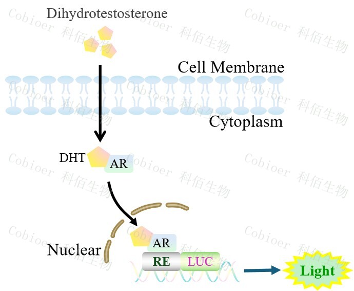 AR Reporter LNCAP Cell(DHT low sensitive)藥靶細(xì)胞,在由調(diào)控因子調(diào) 控并表達(dá)報(bào)告基因的重組細(xì)胞上,穩(wěn)定表達(dá)人 AR。雄激素的代謝產(chǎn)物 DHT(雙氫睪酮) 會(huì)與細(xì)胞上的 AR 結(jié)合,激活 AR 信號(hào)通路,原理見下圖所示。