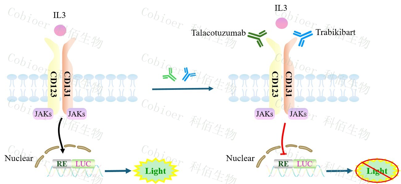 IL3 Effector Reporter Cell 報(bào)告基因藥靶模型很好的模擬了體內(nèi) IL3 的信號(hào)轉(zhuǎn)導(dǎo)過(guò)程,原理見(jiàn)下圖所示。![]() Figure 1. IL3 Effector Reporter Cell 細(xì)胞模型原理圖 |