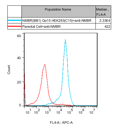NMBR(BB1) Gα15 HEK293 細胞藥靶模型很好的模擬了體內(nèi) NMBR(BB1)&Gα15 的信號轉(zhuǎn)導(dǎo)過程,原理見下圖所示。![]() Figure 1. NMBR(BB1) Gα15 HEK293 細胞模型原理圖 |